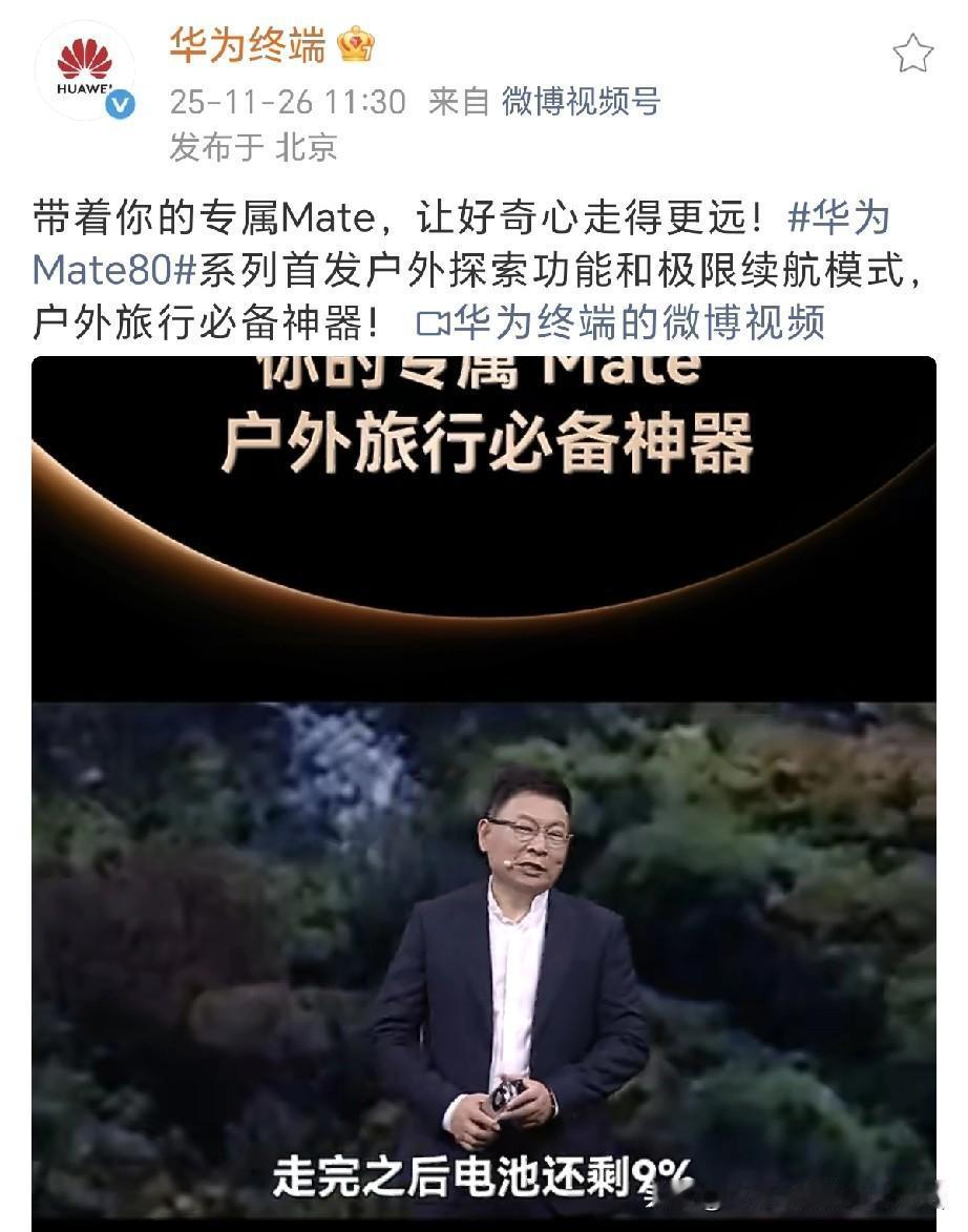 华为到底藏了多少王炸 本以为Mate80系9030够炸裂了,以为全金属机身够炸裂,以为无网络通信够炸裂,当极限续航时长高达14天后,整个市场全炸锅了。 以为在通信上已经做到了极致,万万没想到啊,Mate80在续航上也做到了极致,电池也不是很大,mate 80 PRO max最大也只有6000毫安电池,不像友商7000多,甚至8000毫安,但是中国国家地理的徒步探险队,5位探险家拿着华为mate 80 PRO max探索墨脱秘境,他们走了14天,走完之后,电池还剩9%。华为Mate80系列首发户外探索功能和极限续航模式,可以说是户外旅行必备神器! 说句难听的,友商是笑不出来了,首发户外探索功能和极限续航模式,换做其他厂商,一个无网通信就够其他厂商学了。华为还做自研芯片,自研鸿蒙操作系统...也不是吹捧,打败华为的只有自己。