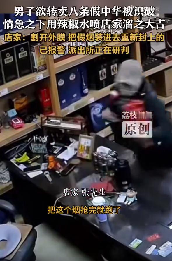 江苏一男子去烟酒店卖8条中华,店家仔细检查发现这竟然是假烟。正准备报警,只见男子不慌不忙的掏出了辣椒水……   近日,江苏徐州的张桩先生遇到了一糟心事。   张先生是开烟酒店的,这一天他正在店里面坐着的时候,一个戴着灰白色帽子和口罩的男子,说手里面有中华烟,愿意低价出售给他。   这种行为是违法的。《烟草专卖法实施条例》有明确规定:   取得烟草专卖零售许可证的企业或者个人,应当在当地的烟草专卖批发企业进货,并接受烟草专卖许可证发证机关的监督管理。   烟草店的烟只能从当地的烟草专卖批发企业进货,收购个人转售的香烟属于违法行为,不但要没收违法所得,还要处以进货总额5%以上10%以下的罚款。   张先生注意到,这名男子手里面的中华烟似乎有些不对劲,就让他把烟放下,拿起香烟仔细检查。   结果发现,这中华烟的两侧贴膜被人用刀割开过,重新封上去的。   一个个检查,8条香烟全都如此。   “卖烟男子”眼见张先生查的这么仔细,顿时心生不安,突然说:“不卖了!”想要将香烟一起带走。   张先生怎么可能让他就这么走了,连续说了多次:“放下!我让你放下!”   同时掏出手机,准备报警。   “卖烟男子”见状顿时着急了,以极快的速度从兜里面掏出来一个小喷枪出来,对着张先生的眼睛就猛喷。   根本没来得及反应的张先生顿时感觉眼睛火辣辣的,明白是被喷辣椒水了。赶紧闪身躲避。结果那“卖烟男子”不依不饶身子越过桌子继续喷他,另一只胳膊则将桌子上的假烟聚拢到一起,一把抱住,然后仓皇逃离。   等到眼睛恢复之后,张先生报了警。警方表示“正在研判”。   卖烟男子的行为可以说十分恶劣。   如果只是试图兜售假烟的话,那属于诈骗未遂。但当张先生准备报警,他掏出来辣椒水的那一刻,整件事的性质就变了,这就属于抢劫了。   虽然这假烟是“卖烟男子”自己的,但当他把假烟放到桌子上那一刻,这假烟就属于“犯罪工具”,是罪证。   刑法第269条规定:犯盗窃、诈骗、抢夺罪,为窝藏赃物、抗拒抓捕或者毁灭罪证而当场使用暴力或者以暴力相威胁的,依照本法第二百六十三条的规定定罪处罚。   当他卖假烟骗局被识破,为了抗拒抓捕使用辣椒水,直接就从诈骗罪转化为了抢劫罪。   如果只是假烟的话,只要不是惯犯,最多也就是行政处罚。现在成了抢劫,从经济犯罪升级成了暴力犯罪,那量刑标准可就高了。