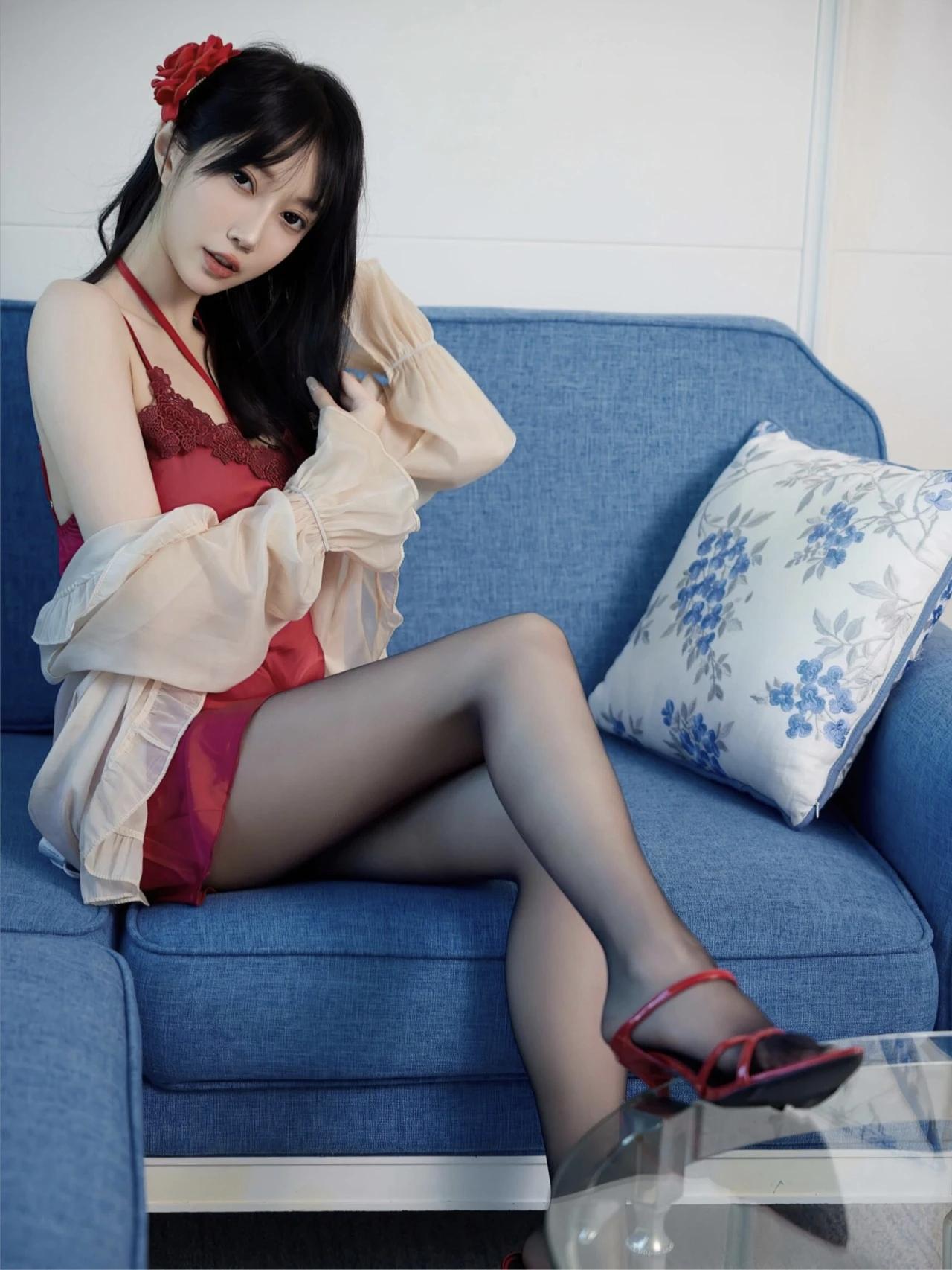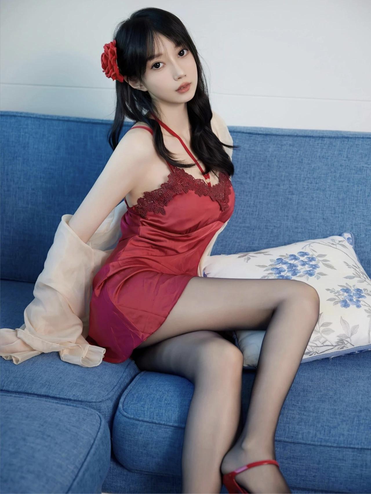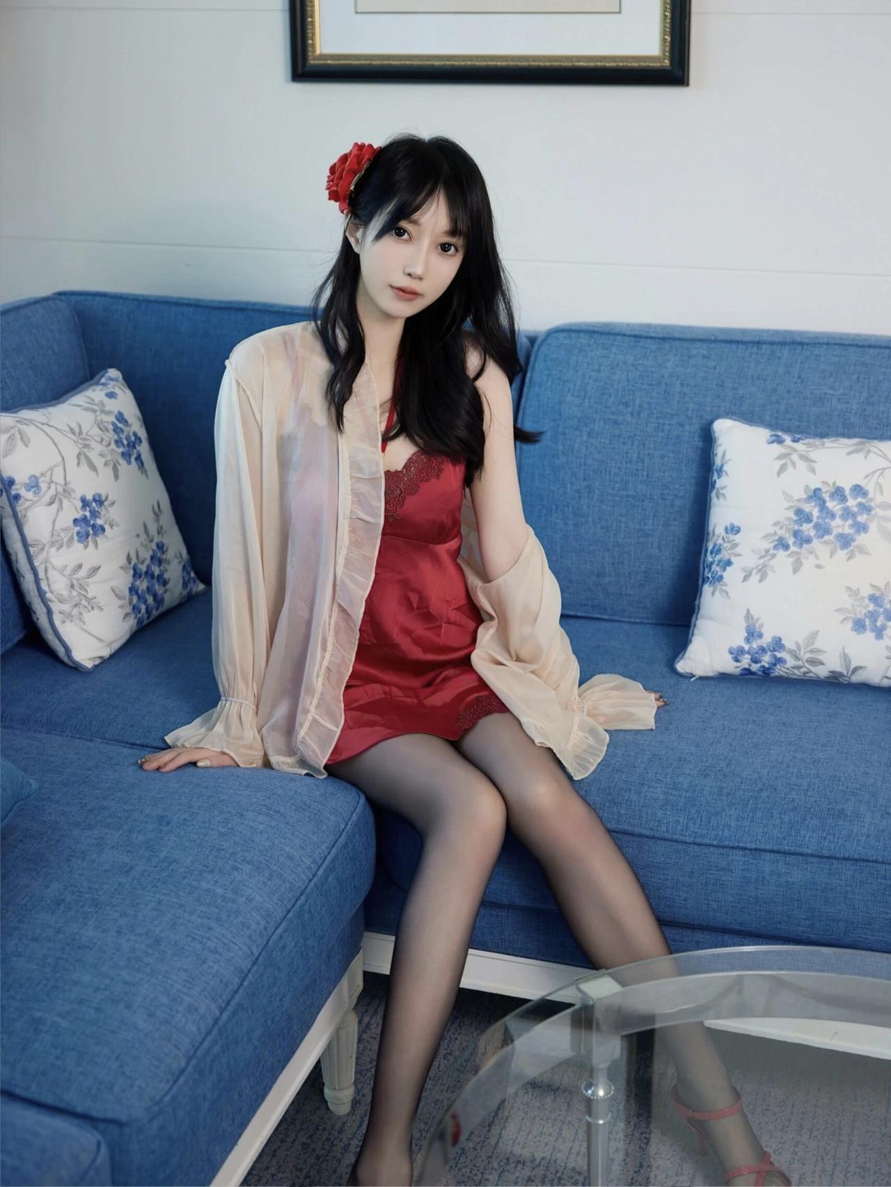 甜美少女心爆棚,红发花饰点缀,蓝沙发上的优雅姿态分享美女穿搭服饰 你心里有没有特别清纯可爱的女孩
