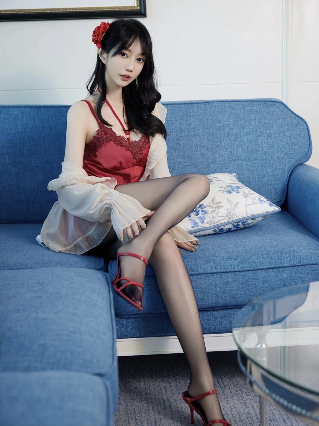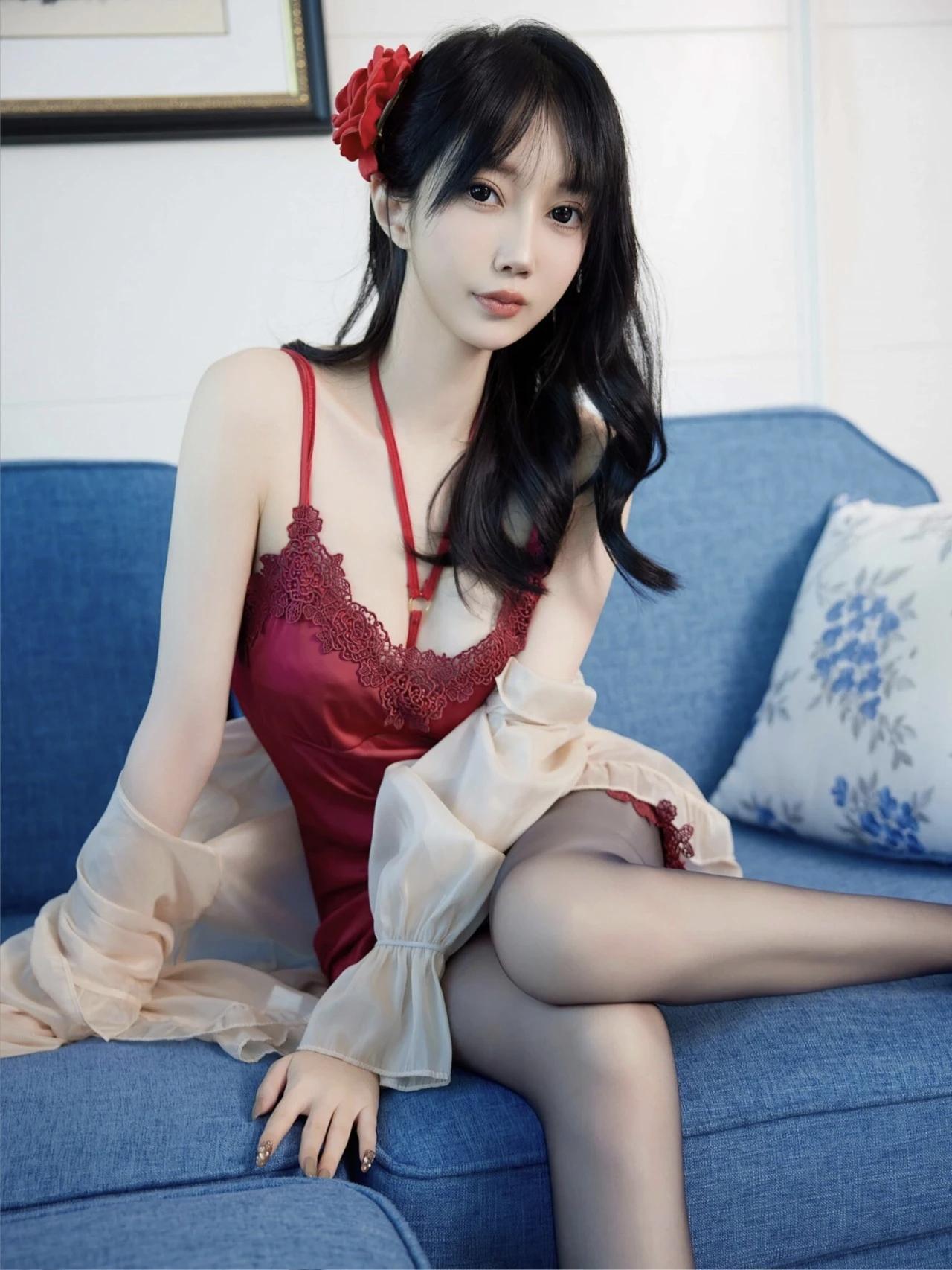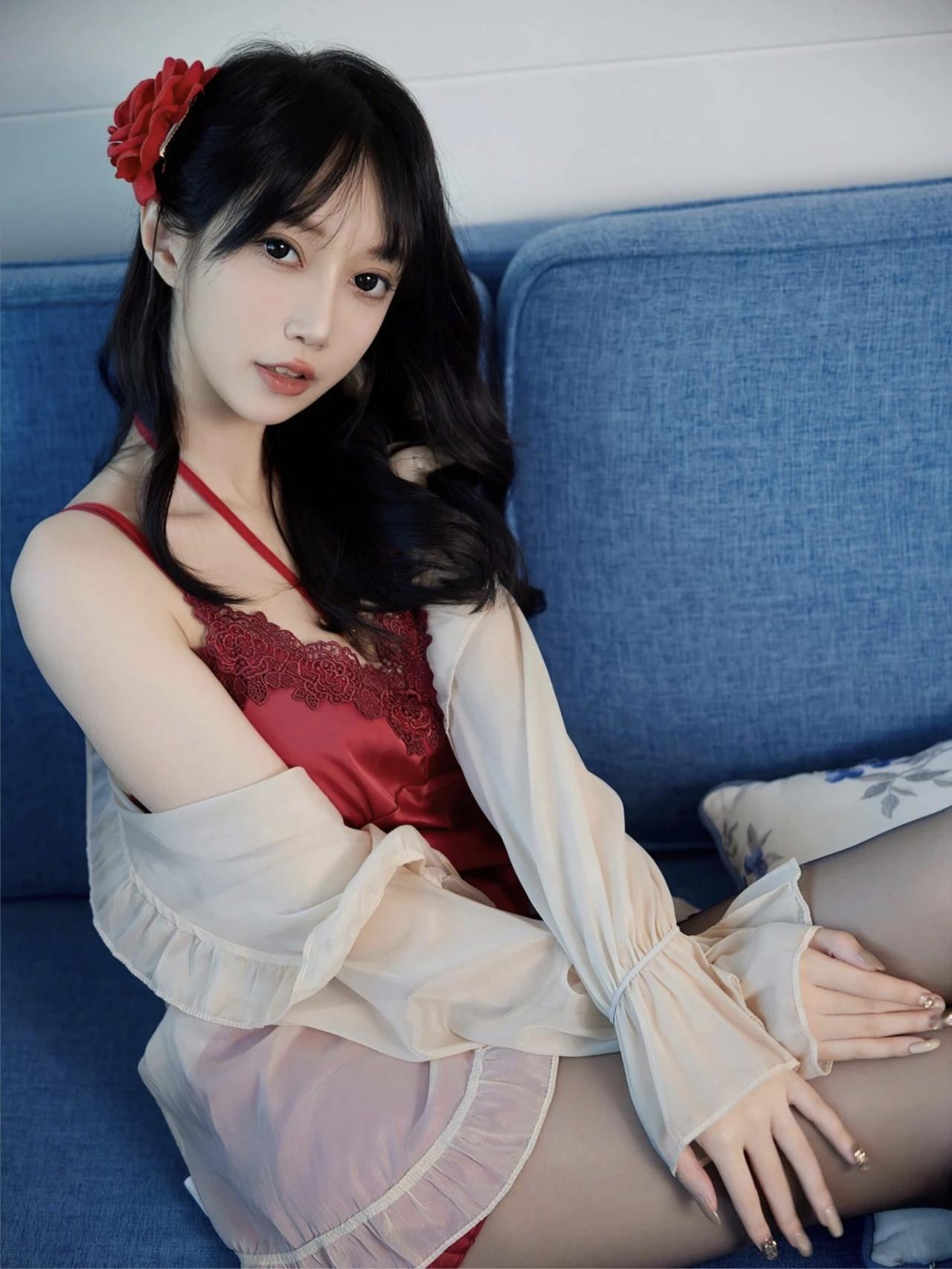 甜美少女心爆棚,红发花饰点缀,蓝沙发上的优雅姿态分享美女穿搭服饰 你心里有没有特别清纯可爱的女孩