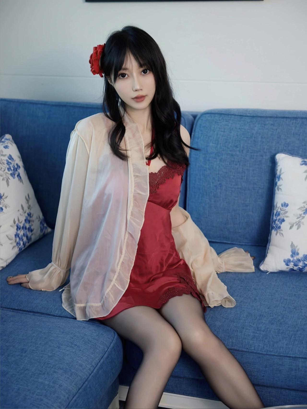 甜美少女心爆棚,红发花饰点缀,蓝沙发上的优雅姿态分享美女穿搭服饰 你心里有没有特