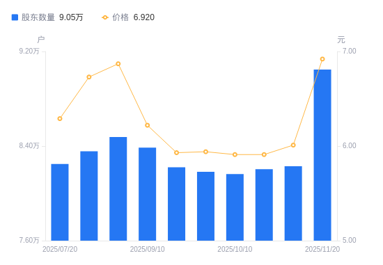 日期A股户数(户)流通A股户均持股数(股)户均持股市值(万元)2025-11-209046511058.637.652025-11-108229812156.057.312025-10-318204312193.847.212025-10-108163412254.937.242025-09-308181712227.527.262025-09-208220412169.957.222025-09-108386811928.497.422025-08-318476911801.718.112025-08-088355911972.608.062025-07-208248812128.057.63