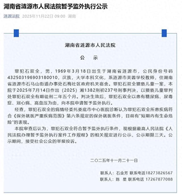 11月26日,@新京报:近日,湖南涟源法院发布公示称,56岁教师石双全猥亵儿童被判刑二年五个月,石双全以患多种病为由申请暂予监外执行,经医院诊断石双全符合保外就医条件,目前有“短期内有生命危险”表现。