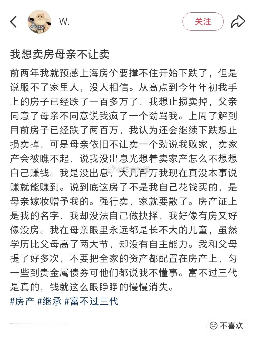 一上海网友发帖称,自己想卖房可母亲不让卖,理由是败家。评论区大多支持这位母亲。对