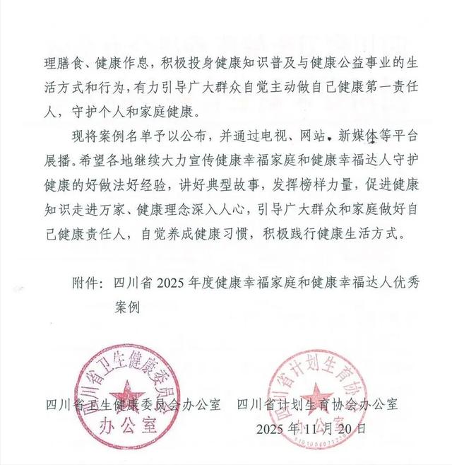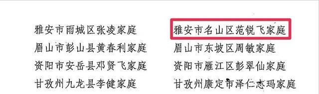 近日,四川省卫生健康委和省计生协会组织开展的健康幸福家庭典型案例征集活动圆满落幕。在各地广泛征集推荐的基础上,经过逐级审核和公示,最终评选出成都市王宇卉家庭等43个家庭为2025年四川省健康幸福家庭典型案例。其中,雅安市名山区范锐飞家庭成功入选。