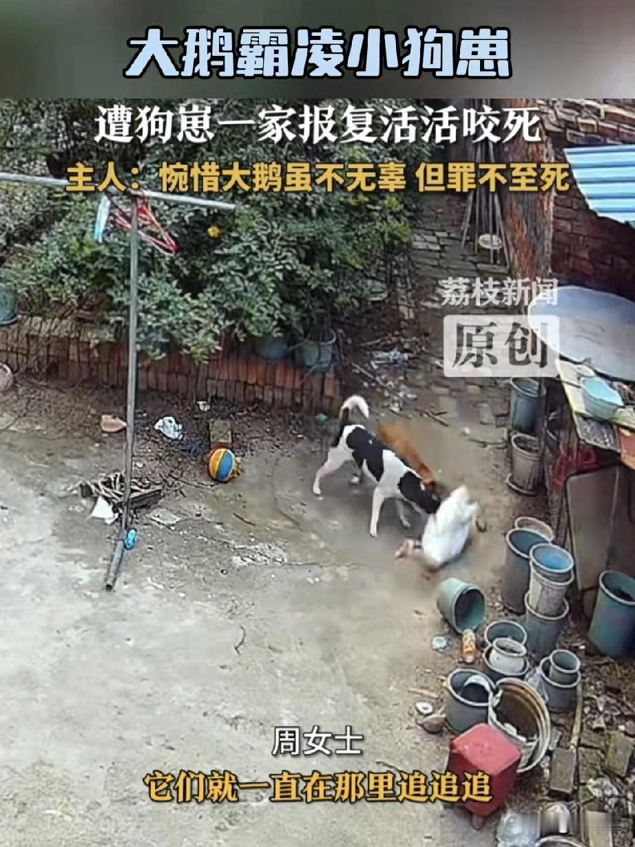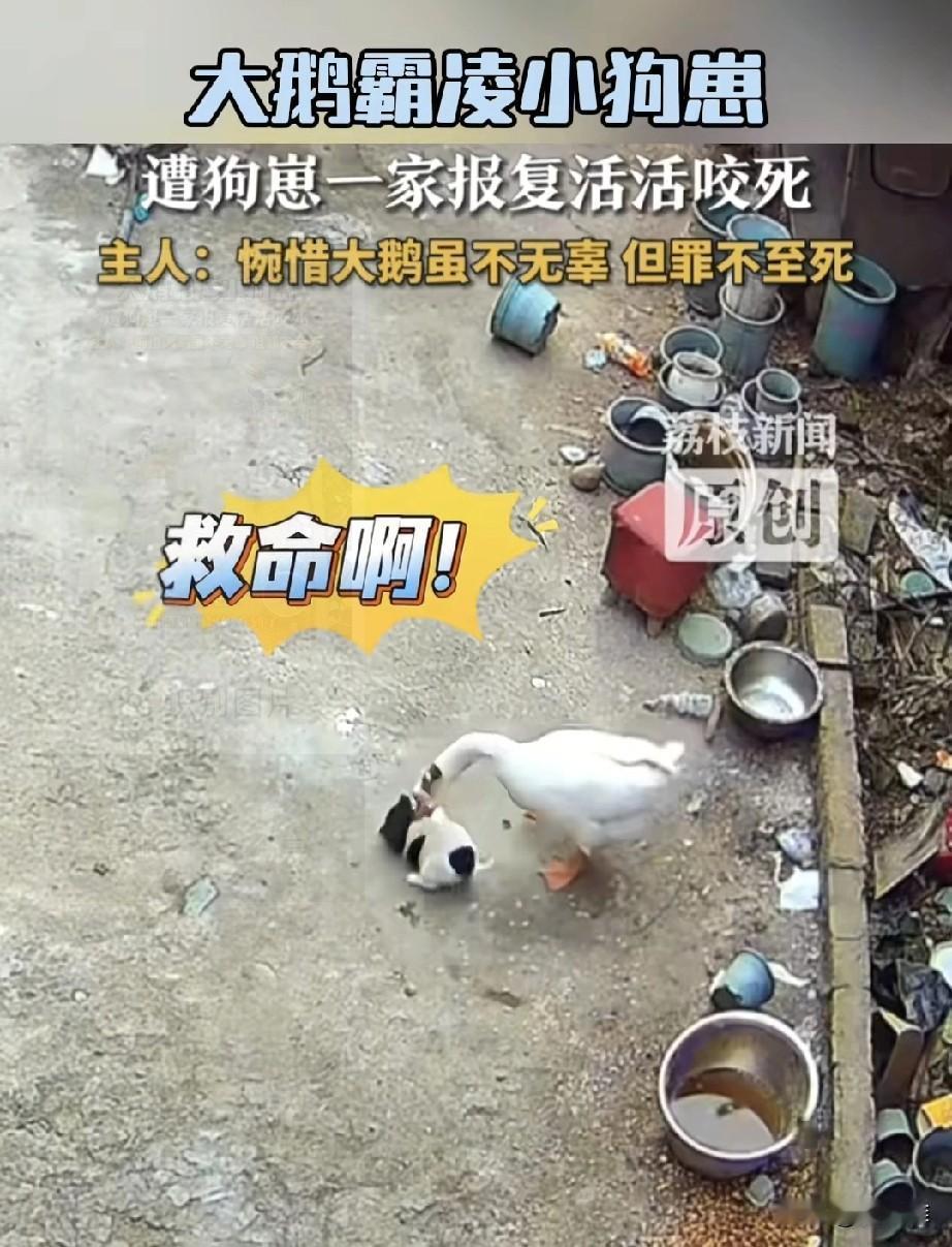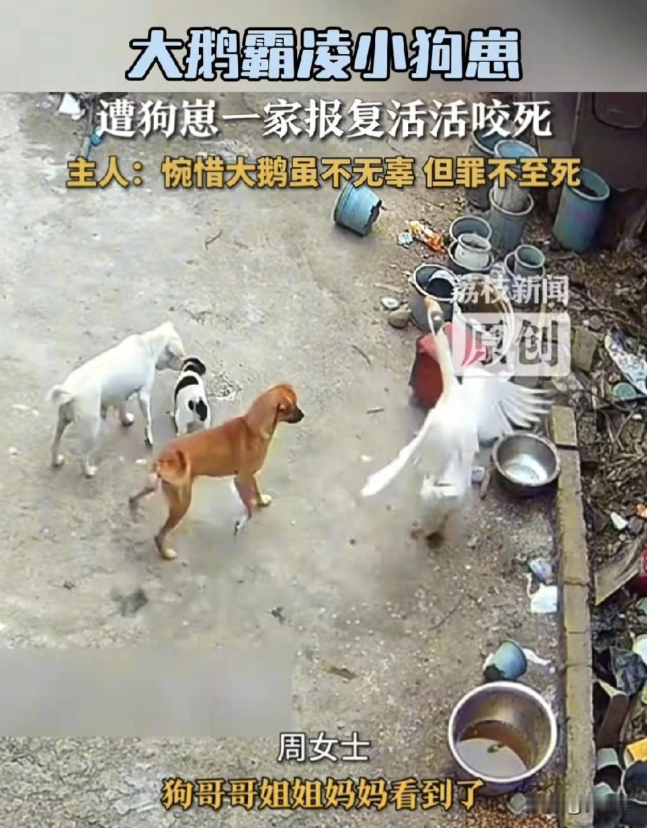 河南有位大姐,早上从镇上买完菜回家,一推开院门,就觉得不对劲,院里她家养的那只大白鹅,平时很威风这会却直接挺地躺在墙根底下,一动不动,她心里“咯噔”一下,心想:坏了,别是遭了贼,村里以前可丢过鸡鸭的。 她赶紧三步并作两步,跑到院子角落去翻看监控,这一看,可把她给看傻眼了——哪有什么贼啊,下这“狠手”的,竟然是自家养的那一窝狗子! 监控里头还原了事情的来龙去脉。当时,家里最小的那只狗宝宝,正趴在院里的石板上舒舒服服地晒太阳,那小模样别提多安逸了。可谁能想到,那只霸道惯了的大白鹅,不知道哪根筋不对,伸着长脖子就冲了过去,照着狗宝宝的后背就是一顿猛啄。小狗被啄得“呜呜”直叫,听着就让人心疼。 这下可捅了马蜂窝了!狗妈妈就在不远处的窝里,一看自家宝贝孩子被欺负,瞬间就炸了毛,“呼”地一下冲了出来,对着大白鹅就是一顿愤怒的狂吠。这还不算完,另外两只半大的狗孩子,估计是狗宝宝的哥哥姐姐,一看妈妈冲上去了,也立马加入“战团”。好家伙,一家子齐上阵,三面夹击,把那只大白鹅围在中间追着咬。 这场面,简直是一边倒,大白鹅平时欺负小动物是厉害,可哪见过这护崽心切的阵仗,扑腾了没两三分钟,就倒在地上不行了。 大姐反复看了两遍监控,心里是又生气又想笑,还有点心疼。她后来跟人说,这鹅平时在院里就是个小霸王,追得鸡飞狗跳那是常事儿,啄这只最小的狗宝宝也不是一回两回了,要说它一点不冤,那也是真的。可话又说回来,它毕竟就是个家禽,脑子简单,再霸道也闹不出多大的伤,就这么被活活咬死,也确实是“罪不至死”,挺可惜的。 这事儿传到网上,可把网友们给热闹坏了。有人说:“这就是霸凌者的下场!看着真解气!” 还有人就差给狗子们鼓掌了,说:“狗子们肯定是忍它很久了,这回新账旧账一起算!” 说实话,很多人小时候都有被大鹅追着拧过的“悲惨”经历,那家伙,拧一下大腿能青一块,疼得要命。所以不少人看到这结局,内心甚至有点暗爽,觉得狗子们算是替自己“报仇”了。 不过笑归笑,解气归解气,仔细想想,这事儿也挺发人深省的。你看那大鹅,仗着自己厉害就老欺负弱小的,结果把老实巴交的狗一家给逼急了,直接来了个“反杀”。这跟咱们人有时候也挺像的,有些人总觉得自己厉害,就欺负别人,觉得人家不敢还手。可你别忘了,兔子急了还咬人呢,谁都有个底线,一旦被逼到份上,爆发的力量可能是你想象不到的。 所以啊,不管是动物还是人,都得记住个道理:与人为善,别欺负人。你不想被欺负,那就也别去欺负别人。今天你仗着厉害欺负了别人,没准明天,就被更厉害的角色,或者被团结起来的力量给教训了。这大白鹅,就是个活生生的例子啊!