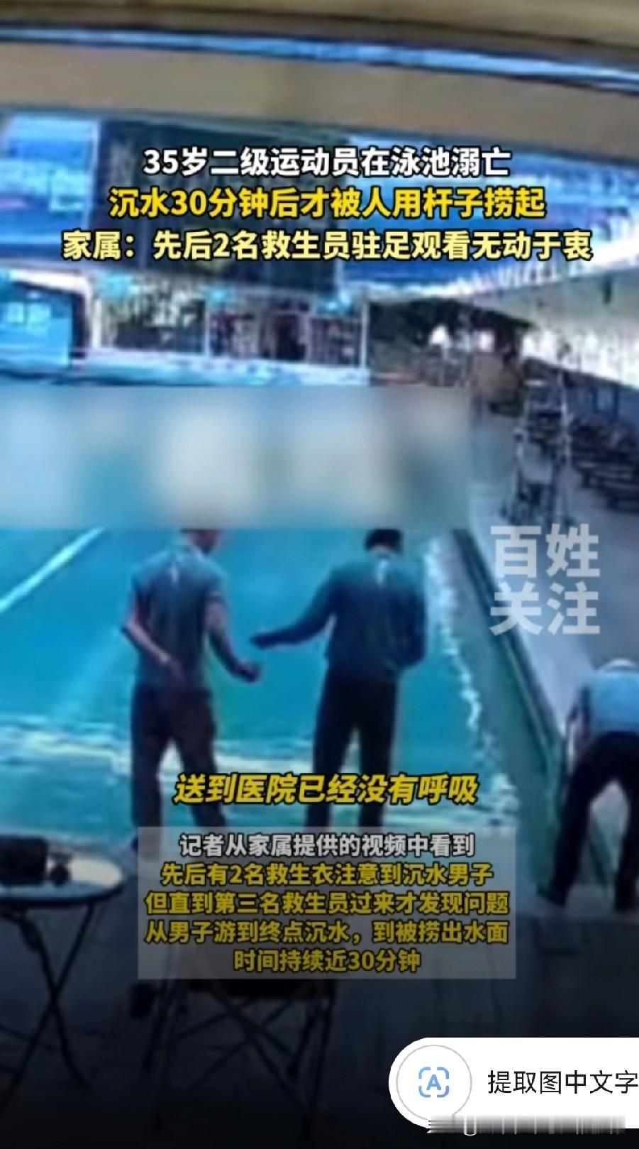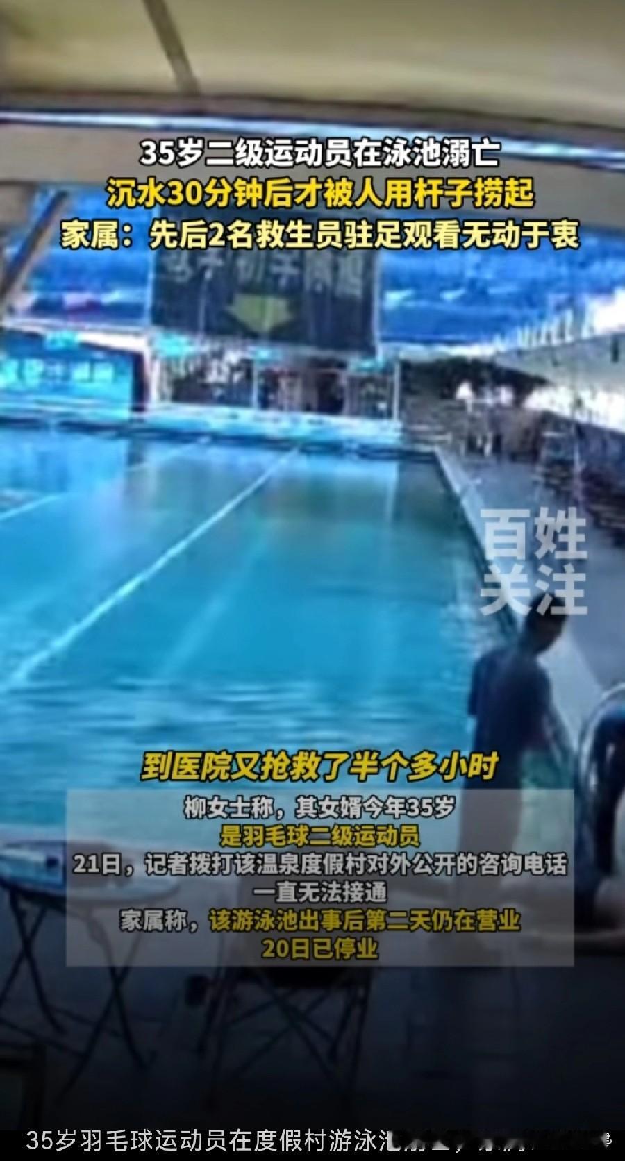 35岁羽毛球运动员厦门度假村游泳池溺亡,家属怒诉:3名救生员紧邻,却沉水30分钟无人施救?警方已介入调查! 11月17日,一起令人心痛的溺水事故发生在厦门某温泉度假村的室内泳池。一名35岁的羽毛球二级运动员,在享受游泳爱好的同时,却意外沉入水底,近30分钟无人伸出援手,这背后的冷漠令人震惊。 根据死者岳母柳女士回忆,当天上午10点多,女婿穿着脚蹼在泳池自由遨游,然而返回终点后竟未再浮出水面。令人触目惊心的是,现场有3名救生员却似乎毫无紧迫感:一人站在男子沉没的附近“观望”,另一人匆匆扫一眼便离开。直到最后,一名救生员才发现异常,用杆子将男子救起,但此过程耗时近半小时,错过了最佳救援时机。 35岁的羽毛球运动员,身体素质过硬,却因游泳这份爱好丧命于泳池,家属痛苦不已,也对现场救生措施表示强烈质疑和愤怒。事发后,厦门同安区警方已介入调查,试图还原真相、厘清责任。 这起事故再一次戳中了公众神经:救生员是“守护生命的最后一道防线”,但当他们选择观望、迟疑甚至漠视时,生命可能瞬间失去保障。我们期待监管层面强化管理和培训,让“救生员”真正做到“见水即救”,不给悲剧留下任何空隙。 网友纷纷留言:“还有啥理由拖延救援?”“生命停留在等待中,不是故事,是悲剧。”只有全社会共同关注与监督,才能让每个泳池、每个水面都多一份安全,多一份守护。 这不该只是新闻,而应是一次全民警醒。说到底,救援不是“看热闹”,而是争分夺秒的生死时刻。对此,你有什么看法?留言分享你的声音,一起守护生命的最后一道防线!