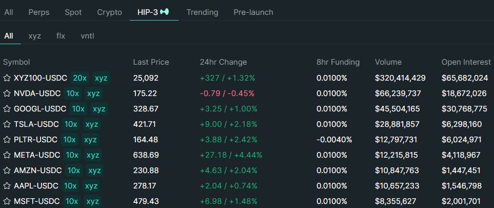 吴说获悉,据Hyperliquid界面,HIP-3自定义部署市场已上线,近24小时交易量超过5亿美元。目前已经有xyz、flx和vnti三个分区,涉及超过20种代币,其中主要以股票标的为主;XYZ100近24小时交易量达3.2亿美元,NVDA达6,600万美元,GOOGL达4,500万美元等。