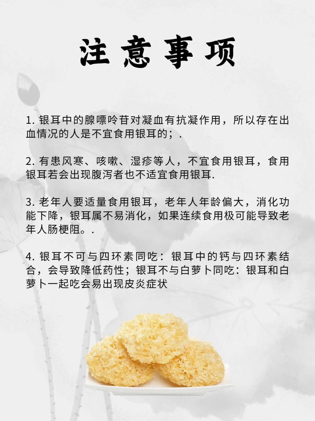 每天认识一味中草药——【银耳】 真菌类银耳科银耳属植物银耳以子实体入药。 春秋采收,用老斑竹浸猪油制成竹刀采割,将鲜银耳以清水洗净后,晒干即成。 别名:白木耳、白耳、桑鹅、五鼎芝、白耳子 性味:甘;淡;平。肺经;胃经;肾经 功效:补肺益气,养阴润燥。用于病后体虚,肺虚久咳,痰中带血,崩漏,大便秘结,高血压病,血管硬化。 禁忌: 1. 银耳中的腺嘌呤苷对凝血有抗凝作用,所以存在出血情况的人是不宜食用银耳的; 2. 有患风寒、咳嗽、湿疹等人,不宜食用银耳,食用银耳若会出现腹泻者也不适宜食用银耳; 3. 老年人要适量食用银耳,老年人年龄偏大,消化功能下降,银耳属不易消化,如果连续食用极可能导致老年人肠梗阻; 4. 银耳不可与四环素同吃:银耳中的钙与四环素结合,会导致降低药性;银耳不与白萝卜同吃:银耳和白萝卜一起吃会易出现皮炎症状。