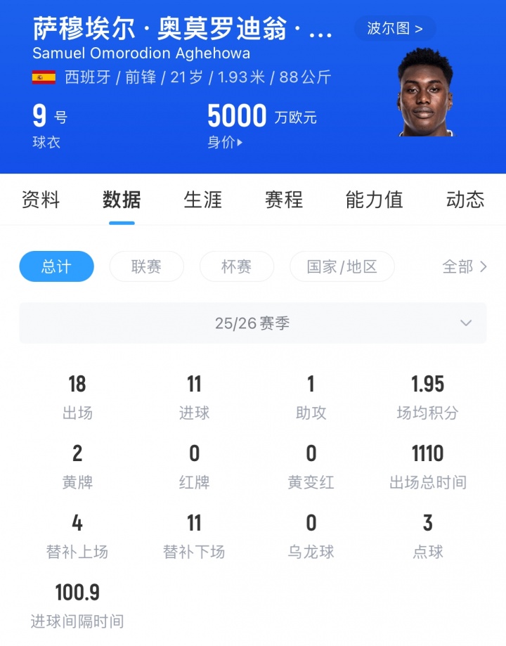 西班牙中锋阿格霍瓦现年21岁,身高1.93米,他本赛季为波尔图出场18次,贡献11球1助,他现身价5000万欧,与波尔图的合同在2029年到期。