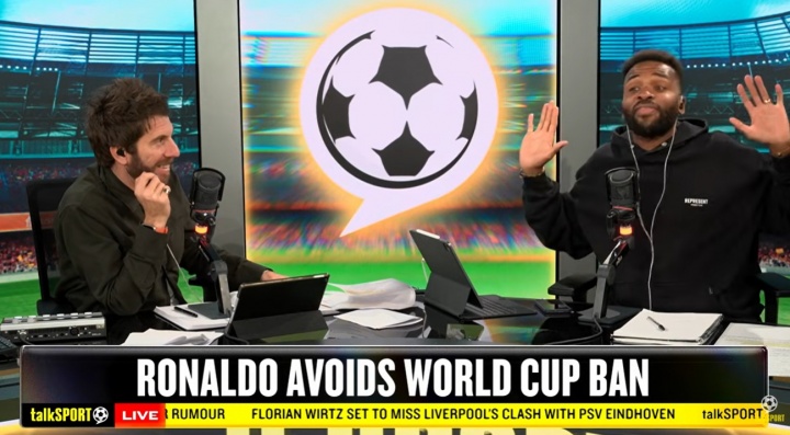 直播吧11月26日讯在talkSPORT的播客节目中,41岁的前英超球员达伦-本特和主持人安迪·戈尔茨坦讨论了C罗国家队禁赛3场,其中2场缓期执行,避免了世界杯停赛的事件。