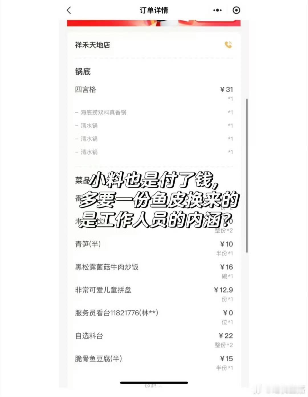 点个锅底就被嘲讽“光吃小料”?福州这位网友的遭遇看完真让人替她委屈!人家根本不是只点锅底,订单里明明白白写着鱼豆腐、笋、炒饭还有拼盘,加上锅底就六七十块,再算上两份小料22块,一顿下来花了八九十块,这哪是“薅羊毛”,明明是正儿八经的消费。结果就因为想多要一份鱼皮凉菜,服务员不仅拒绝,还阴阳怪气地内涵她“点个锅底就靠小料吃饱”,换谁听了能舒服? 后来门店回应说当天鱼皮数量有限,已经给涉事员工做了培训,还想联系网友补偿,可网友直接婉拒了——估计是心里的疙瘩比一顿补偿餐更难消。其实这事儿根本不是一份鱼皮的问题,而是海底捞近年一连串操作让消费者越来越寒心。2023年就开始强制点付费锅底,不能再单点清水锅,还废除了自带菜的政策;2024年又把小料台的牛肉粒换成要在iPad点的收费肉沫,现在鱼皮限量,说白了就是成本管控的延续。 可管控成本也不能拿正常消费的顾客开刀啊!网友花了近百块,不算低消费了吧?就算真有人只点锅底配小料,只要付了小料费,没浪费食材,那也是人家的消费自由。海底捞当初能火,不就是靠“服务至上”的口碑吗?免费美甲、贴心小服务,让大家觉得花钱花得舒心。可现在呢?一边频繁收缩免费福利、调整收费政策,一边还让服务员带着有色眼镜看人,消费少点就被贴“薅羊毛”标签,这跟之前的服务理念完全背道而驰。 有人说海底捞是被“羊毛党”逼的,可真正的羊毛党是少数,不能因为这部分人就委屈大多数正常消费者。2023年禁自带菜、强制点锅底,说是应对低消,2024年动小料台的牛肉粒,现在连凉菜都要限量,这些操作确实能省成本,但也把消费者的好感一点点磨没了。大家去吃海底捞,吃的不仅是火锅,更是那份被尊重、被重视的体验。现在倒好,花了钱还得看人脸色,连合理要份凉菜都要被内涵,这哪还有当初的贴心劲儿? 消费自由从来不是看花多少钱,只要是合规消费、没有浪费,不管是花几十还是几百,都该被平等对待。海底捞想降本增效没问题,但不能以牺牲消费者体验、丢掉尊重为代价。你觉得花八九十块吃海底捞算低消费吗?要是遇到这种被服务员内涵的情况,你会接受补偿还是直接“拉黑”?欢迎在评论区说说你的看法。 来源:经视直播