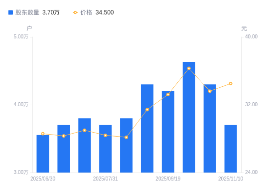 日期A股户数(户)流通A股户均持股数(股)户均持股市值(万元)2025-11-103700019904.3968.672025-10-204300017123.6557.542025-09-304632215895.2357.682025-09-194200017495.4758.102025-08-294300017088.6053.692025-08-083800019320.7754.412025-07-313700019842.9556.332025-07-183800019320.7756.012025-07-103700019842.9556.202025-06-303553220643.1459.00