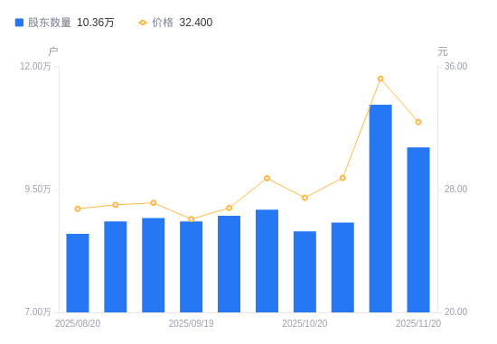 日期A股户数(户)流通A股户均持股数(股)户均持股市值(万元)2025-11-2010360017596.4457.012025-11-1011230016233.2257.192025-10-318830020645.4259.382025-10-208650021075.0457.892025-10-109090020054.9057.642025-09-308969120325.2454.472025-09-198850020598.7753.722025-09-108920020437.1255.472025-08-298850020598.7755.642025-08-208600021197.5756.70