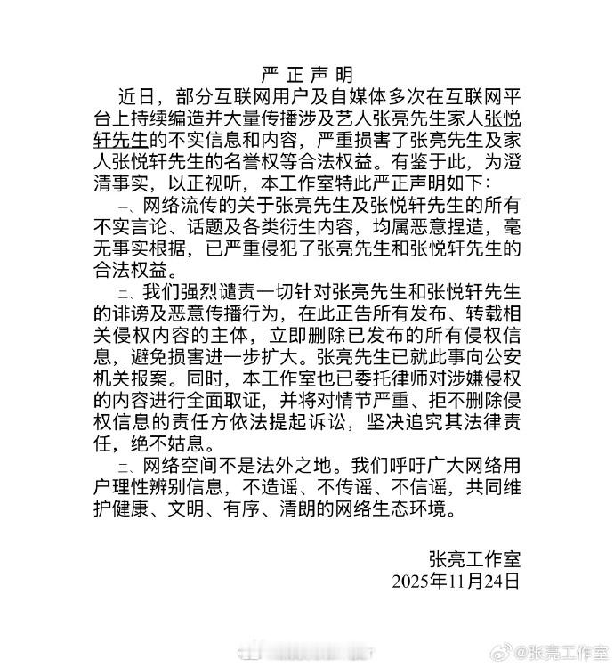 张亮称已报警立案张亮工作室严正声明 此前有网友爆料“麻辣烫奶爸的儿子老在国内闹事,所以被送到国外读书,结果把同学肚子搞大了”,有网友怀疑是张亮和其儿子天天,对此,张亮回应称这是不实言论并透露已经报案,张亮:“网络不是法外之地,请不要无下线造谣!!! ” 张亮回应儿子传闻