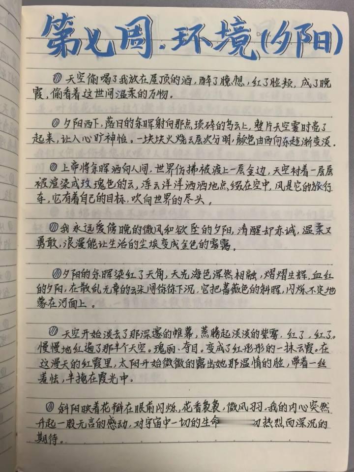 她会将他们分类记录下来,比如专门描写夕阳的记在一页,人民日报的金句记在一页。