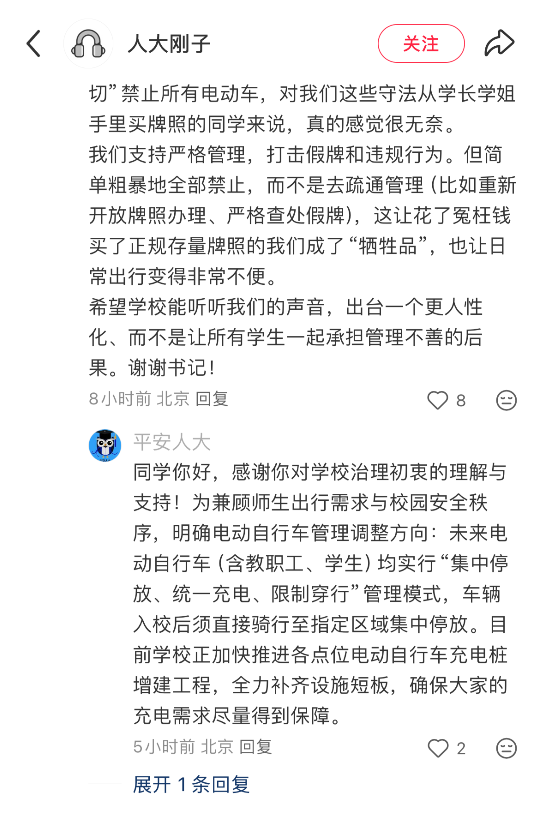 人大保卫部表示,为兼顾师生出行需求与校园安全秩序,明确电动自行车管理调整方向:未来电动自行车(含教职工、学生)均实行“集中停放、统一充电、限制穿行”管理模式,车辆入校后须直接骑行至指定区域集中停放。目前学校正加快推进各点位电动自行车充电桩增建工程,全力补齐设施短板,确保师生们的充电需求尽量得到保障。
