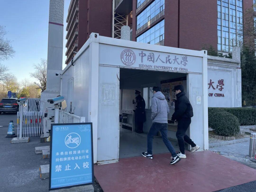 11月25日,北青报记者在人大东门和西门门岗处看到,岗亭外已经立起了蓝色警示牌,提示“未悬挂校园通行证、持假牌照电动自行车禁止入校。”有学生告诉北青报记者,对于同学们的疑问,学校已经通过院系征集学生意见。