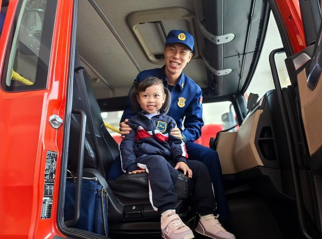 消防员还特别介绍了不同任务中穿着的消防服,讲解灭火救援服与抢险救援服的区别与用途。小朋友们踊跃参与,在消防员的协助下试穿战斗服,亲身体验“小小消防员”的角色,现场气氛热烈。