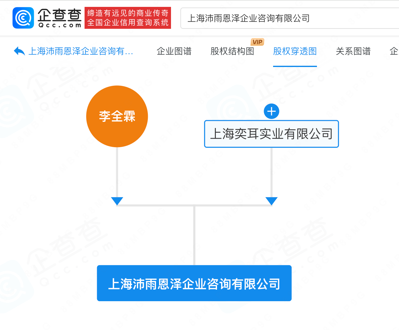 企查查APP显示,11月26日,上海沛雨恩泽企业咨询有限公司注册成立,注册资本20万元,李全霖(李沛恩)@李沛恩Pein_担任法定代表人,其与上海奕耳实业有限公司共同持股,该公司经营范围包括演出经纪;电影发行;广播电视节目制作经营等。
