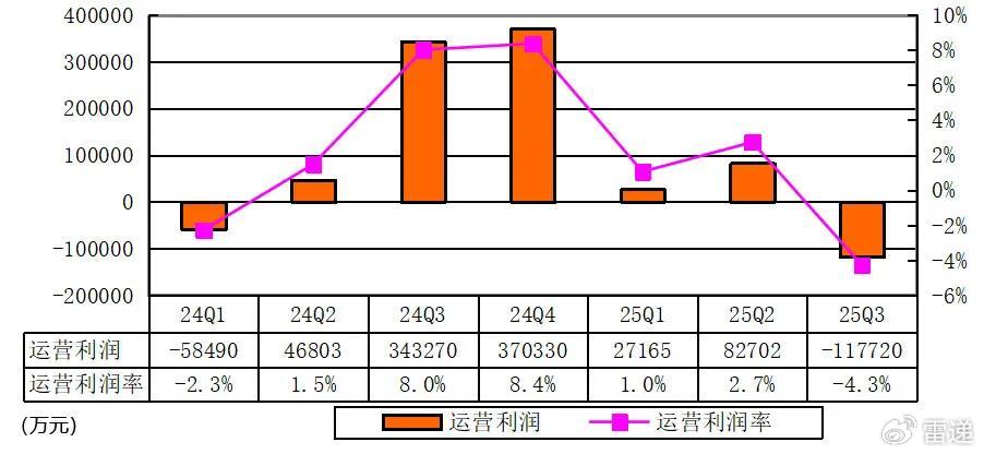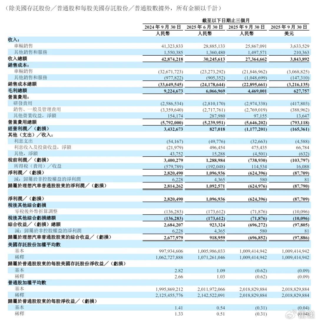 理想汽车2025年第三季度经营亏损为12亿元(1.65亿美元),2024年第三季度经营利润为34亿元;净亏损为6.24亿元(8770万美元),经调整净亏损为3.6亿元(约5050万美元)。