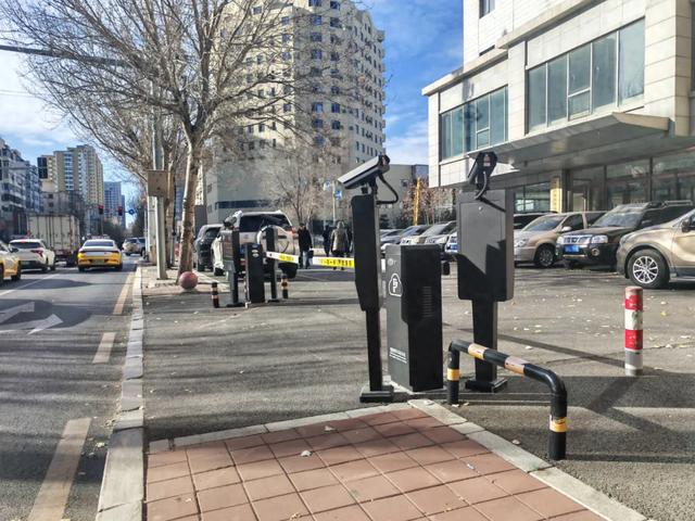 两根道闸杆将人行道和非机动车道圈在停车区内