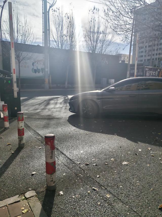 为阻隔外来车辆,行道树旁还立着两根道闸杆。恰逢一辆新能源车驶出,识别车牌后道闸杆抬起。