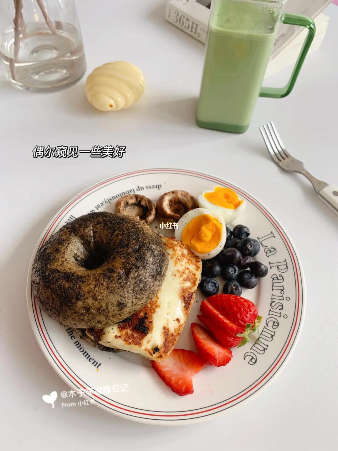 🍳早餐:草莓🍓|蓝莓|黑芝麻贝果|煎奶酪|鸡蛋|口蘑|青汁豆浆