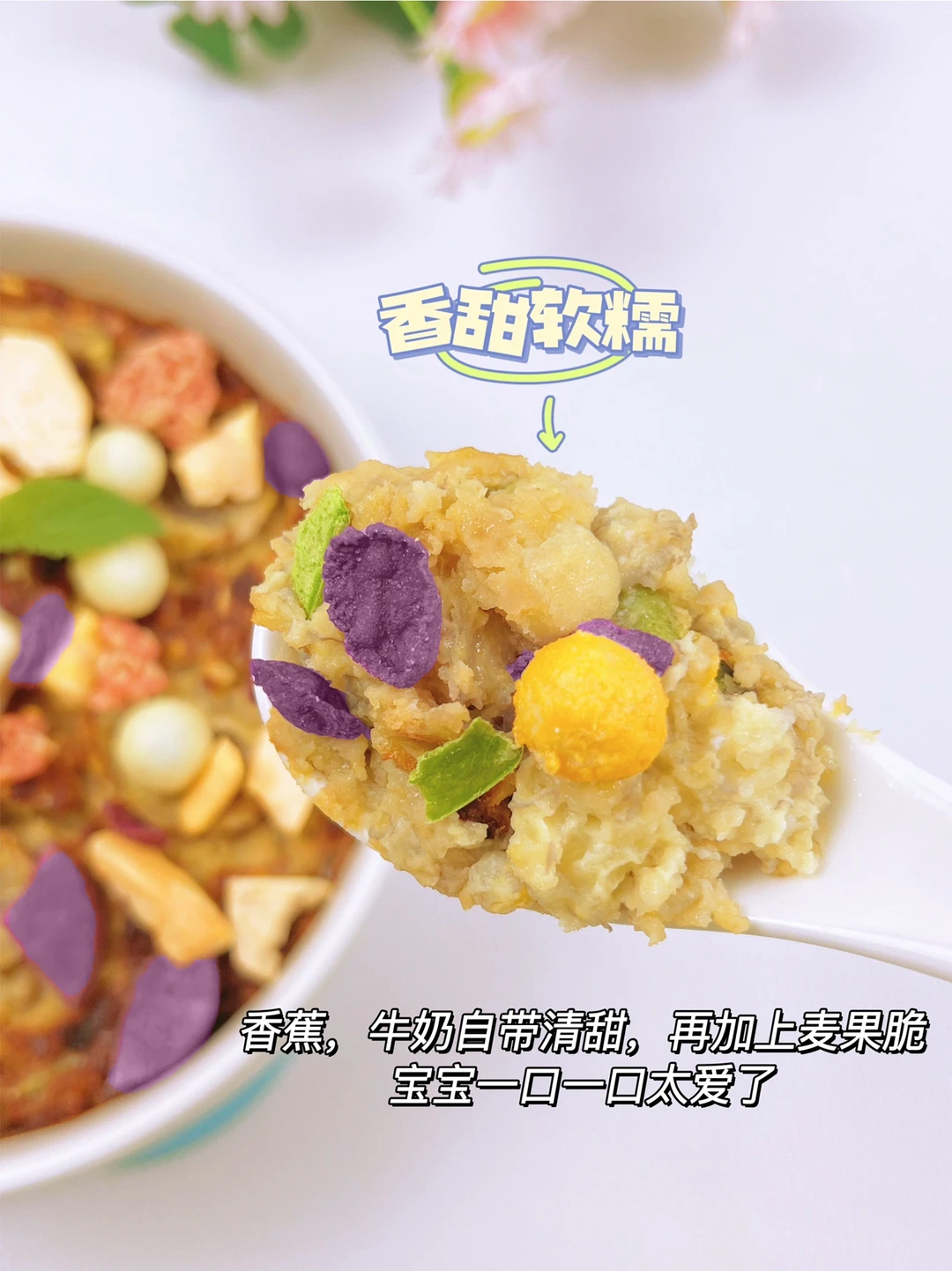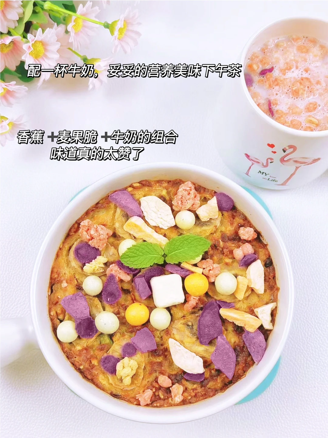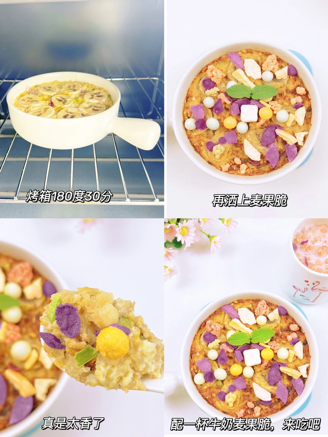 🔸做法:香蕉压成泥,加鸡蛋,配方奶,桂格高蛋白麦果脆,搅拌均匀,倒入烤碗中,顶部放香蕉片,烤箱180度烤30分,出锅放一层麦果脆,真的是营养又美味!