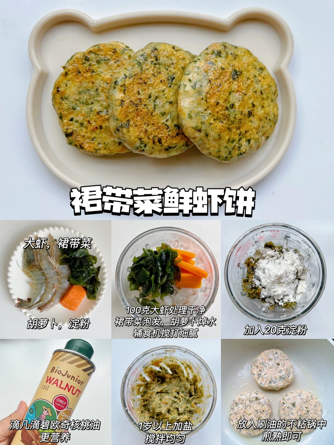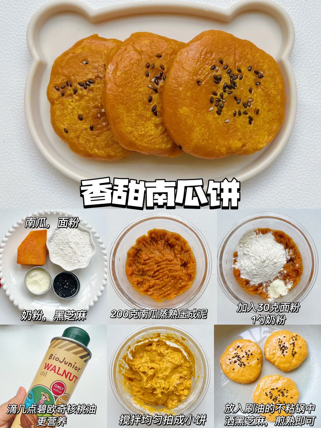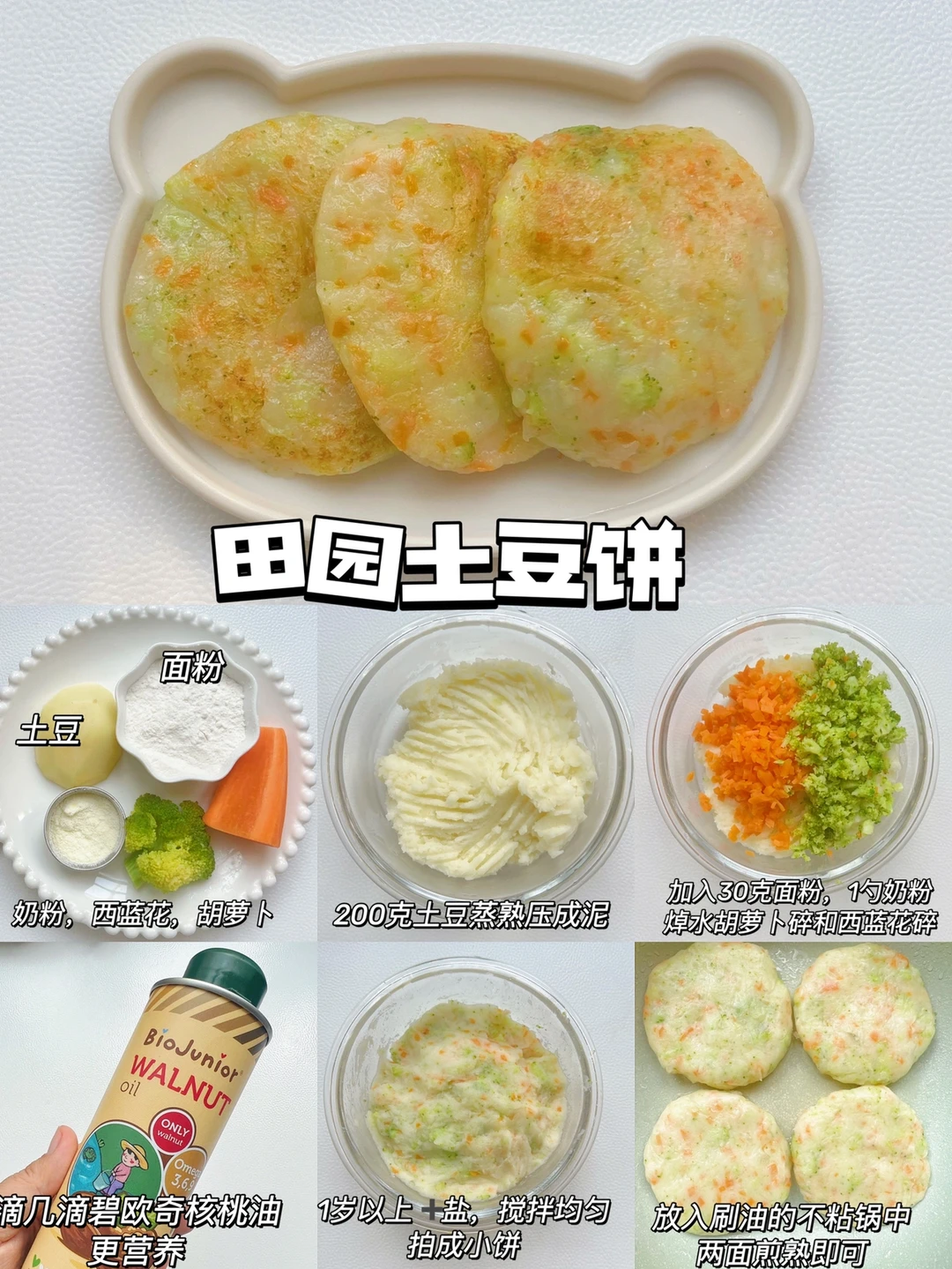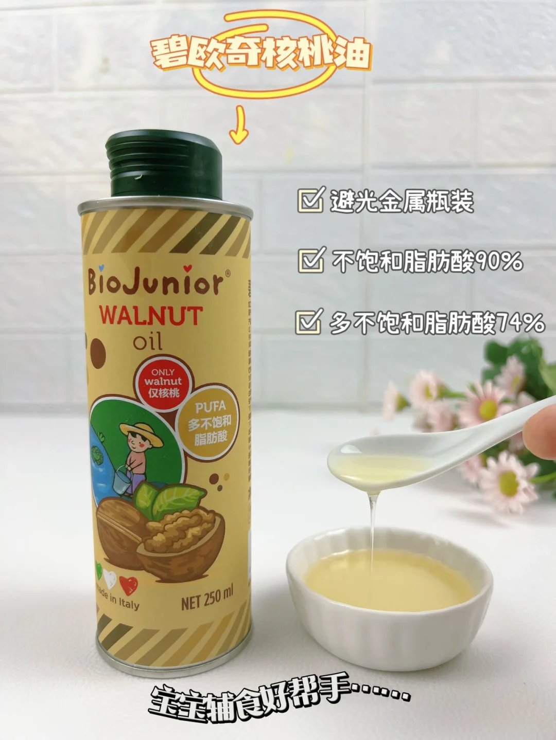 🔅今天做小饼,我特意还滴了几滴碧欧奇核桃油,营养又美味,它采用密封金属罐装,能更好的避光锁鲜,不饱和脂肪酸含量90%,能为宝宝提供更好的营养,低温冷榨工艺,保证健康安全的同时,还避免了营养流失,宝妈们可以放心选择哦~