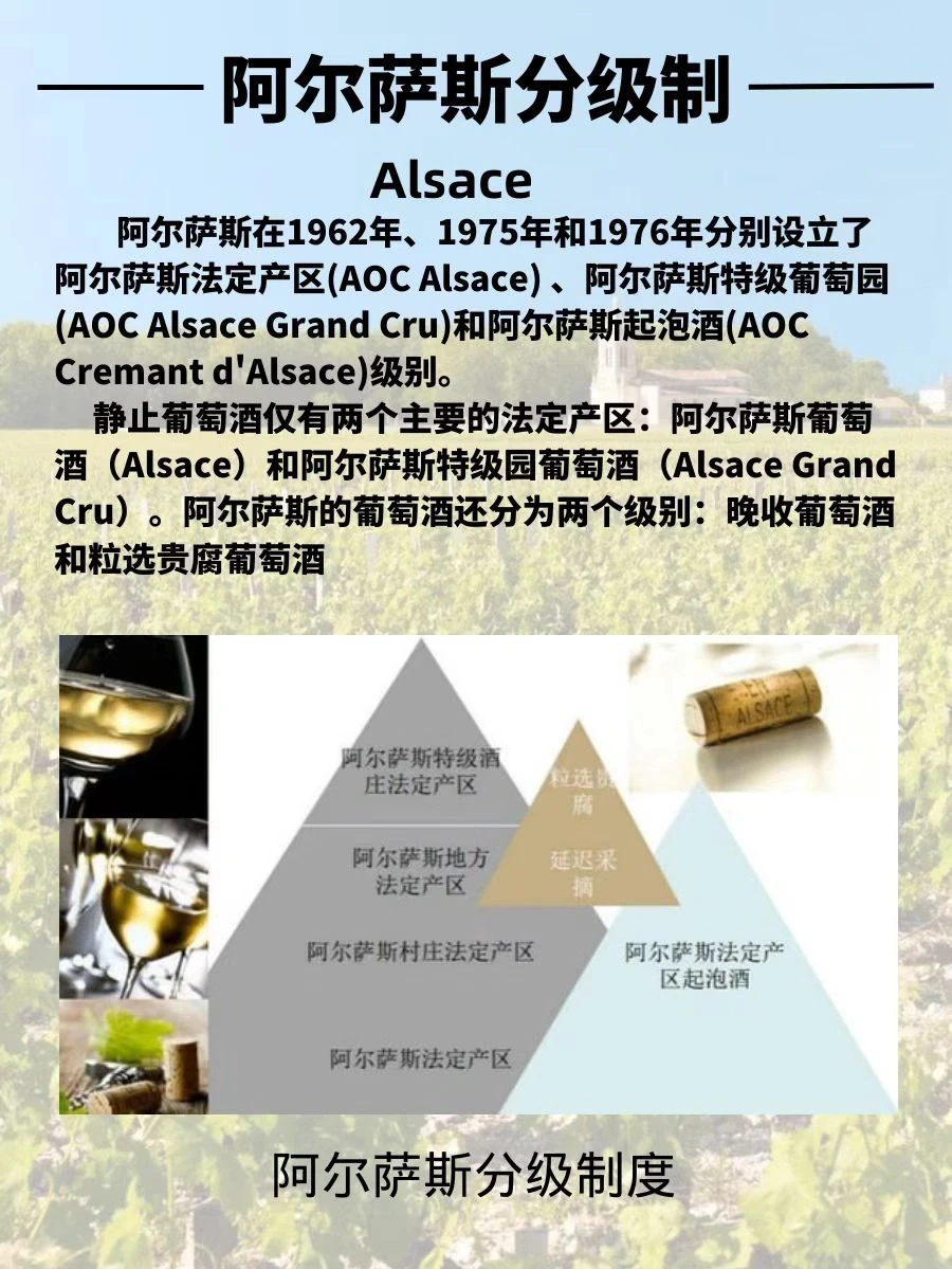 阿尔萨斯静态葡萄酒分为Appellation Alsace Controlee(阿尔萨斯法定产区)和Appellation Alsace Grand Cru Controlee(阿尔萨斯特级园法定产区)。