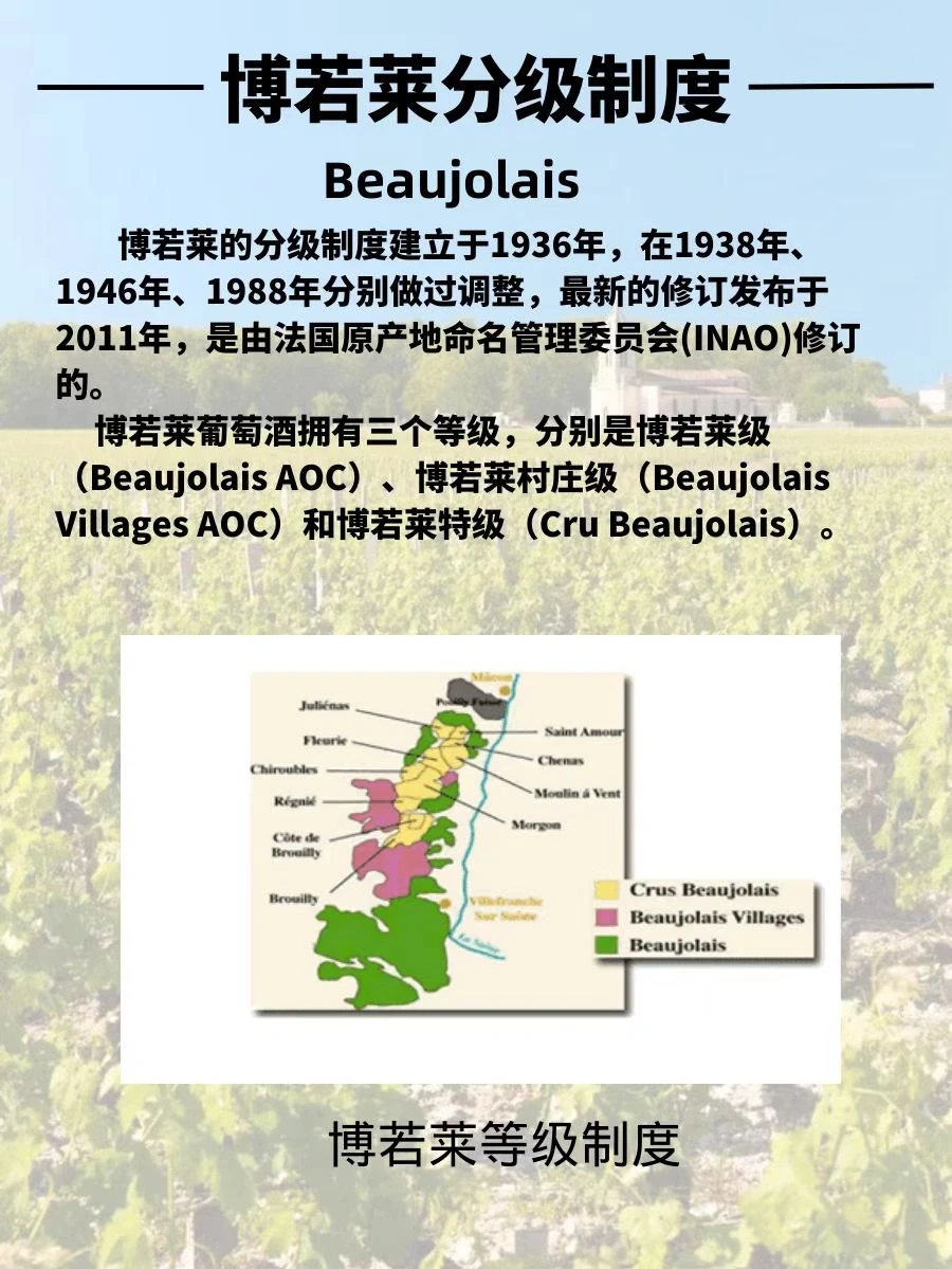 分为博若莱大区级(Beaujolais)、博若莱村庄级(Beaujolais-Villages)和博若莱特级村庄级(Beaujolais Cru)