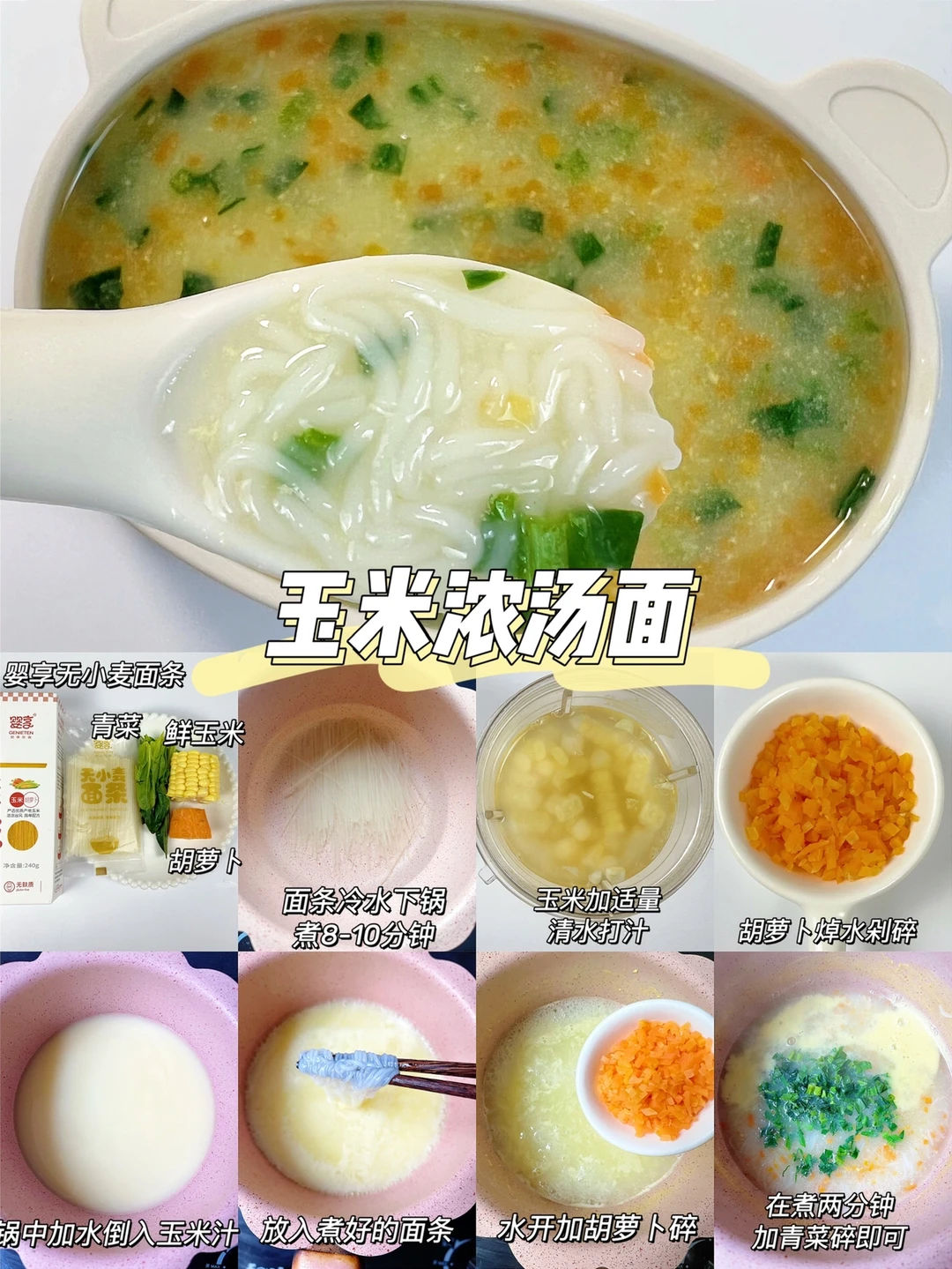 无小麦面条冷水下锅,中小火煮10分钟左右捞出备用,玉米粒➕水辅食机打成玉米汁,过滤下更细腻,把玉米汁倒入锅中,可以加少量水,锅中水开加入煮好的面条,煮两分钟左右,加入焯水胡萝卜碎和青菜碎,继续熬煮2分钟