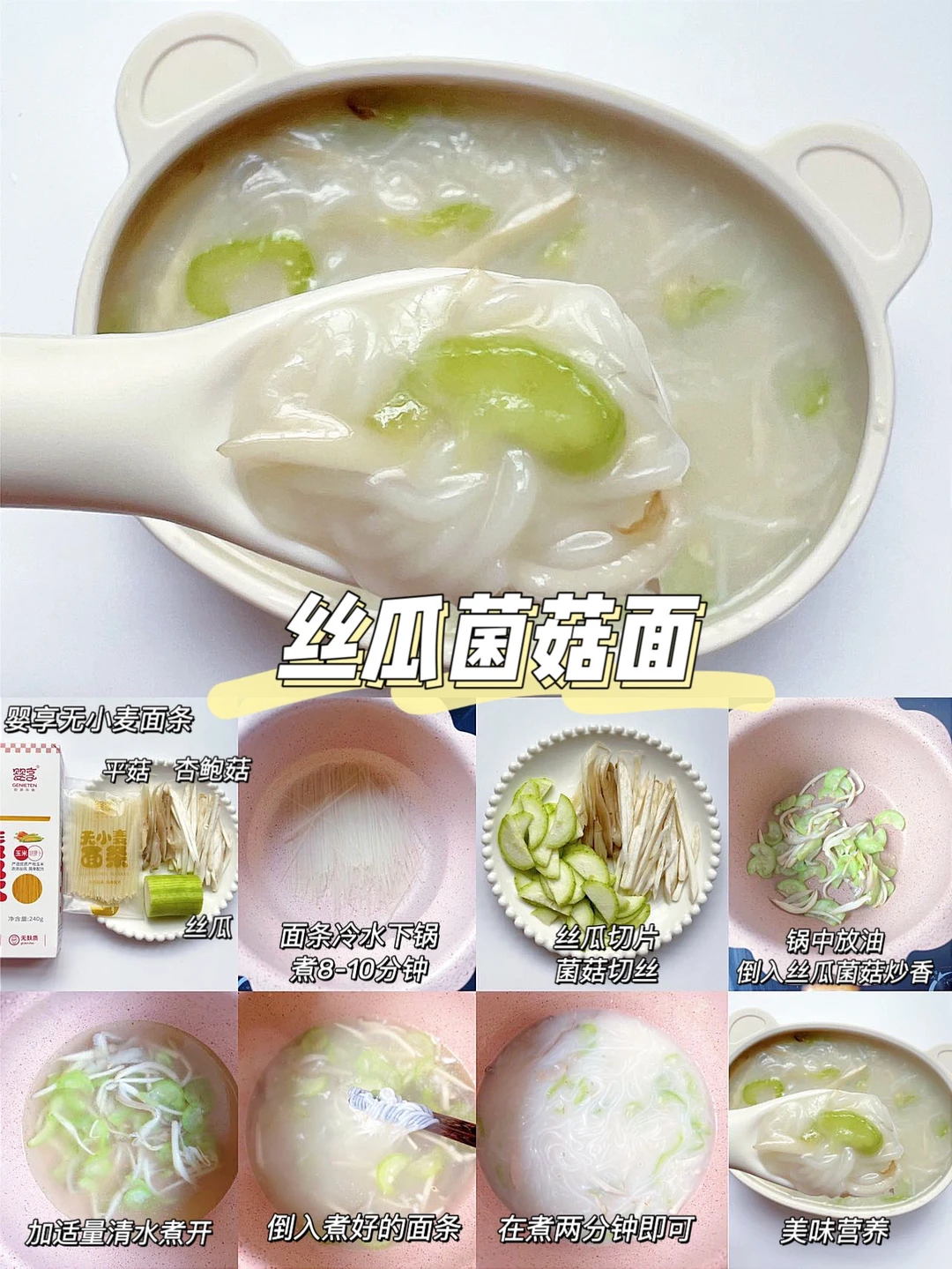 无小麦面粉冷水下锅煮10分钟左右备用,丝瓜和菌菇都切成自己喜欢的形状,然后锅中倒油炒熟,加入适量水,水开再放入煮好的面条,继续熬煮2分钟!