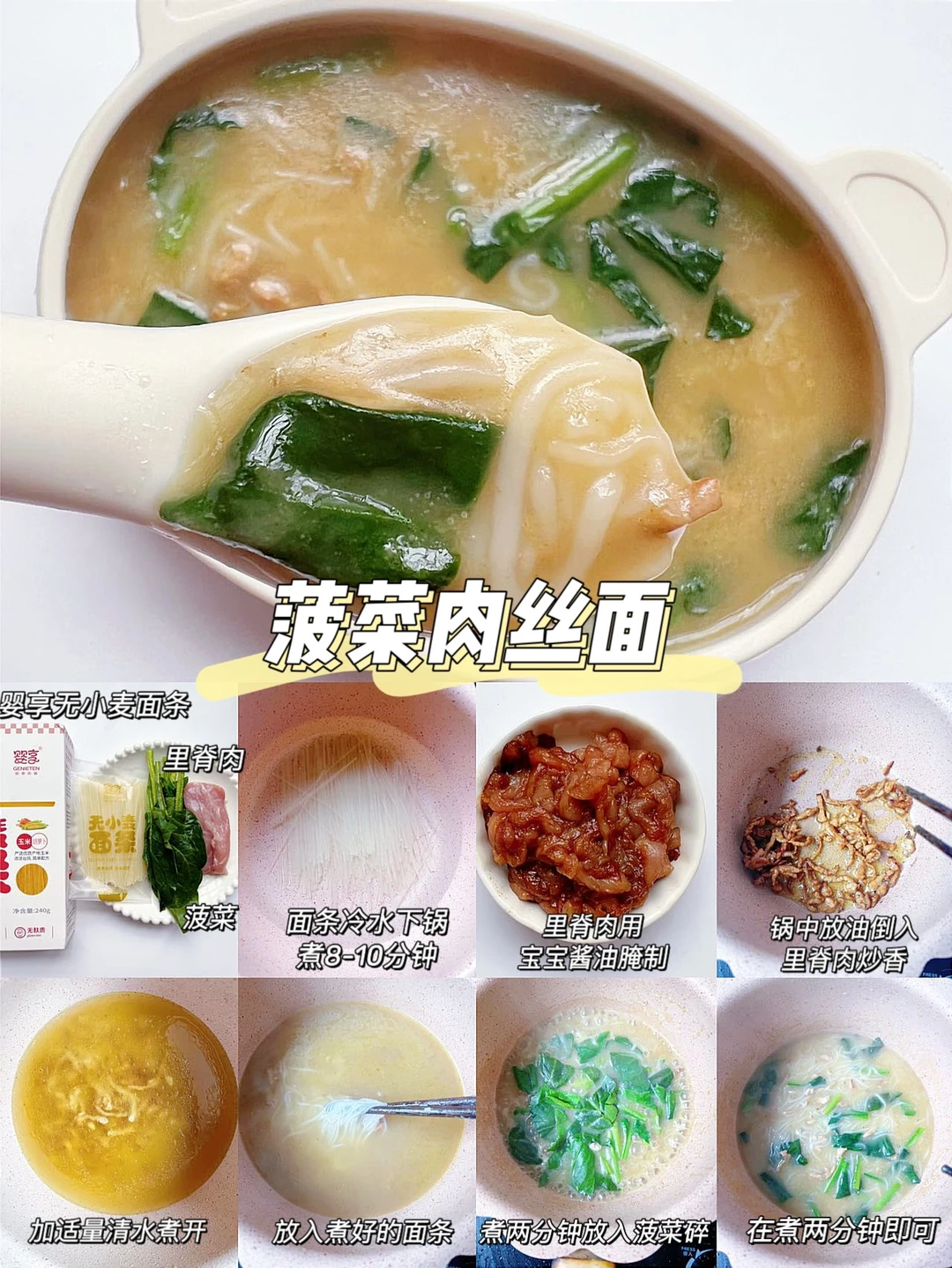 无小麦面条冷水下锅煮10分钟左右,里脊肉切丝宝宝酱油腌制15分钟左右,锅中油热炒熟肉丝,加水煮开下入煮好的面条,继续煮2分钟,加入切好的菠菜,继续煮1分钟,1岁以上加调味品