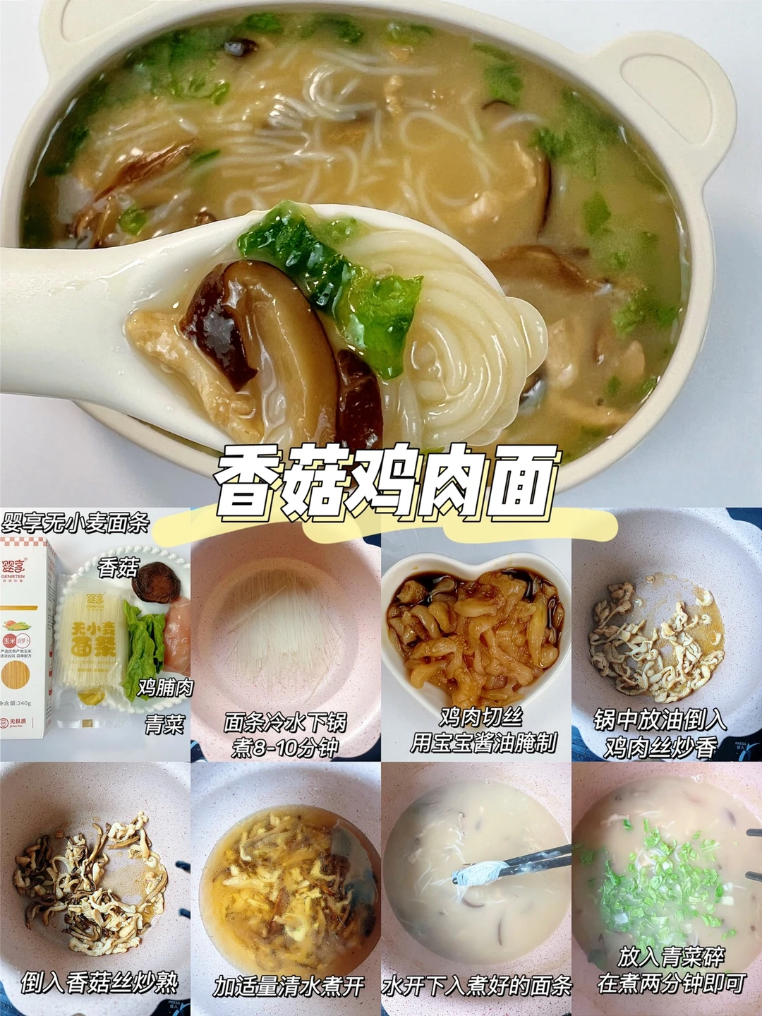 无小麦面粉冷水下锅中小火煮10分左右备用,香菇焯水切小条,鸡肉切丝,锅中倒油放入鸡肉翻炒,再加入香菇,炒熟➕适量水,水开下入煮好的面条继续熬煮2分钟,加入切好的青菜碎,再煮1分钟出锅,1岁以上加调味品!
