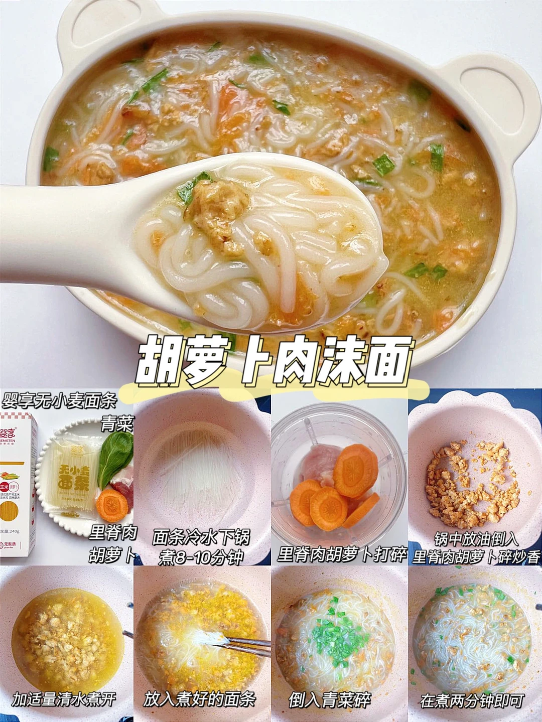 无小麦面条冷水下锅煮10分左右,捞出备用,里脊肉葱姜水去腥,和胡萝卜一起放入辅食机搅打成肉沫。锅中倒油,加入打好的胡萝卜肉沫,炒熟,加适量水,水开再加入煮好的面条,小火继续熬煮2分钟,加入青菜碎,再煮1分钟