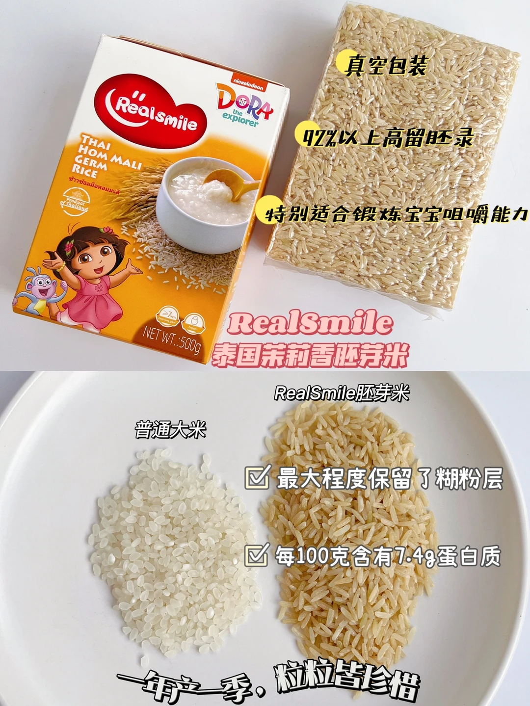 今天我用的胚芽米是RealSmile泰国茉莉香胚芽米,它留胚率高,蛋白质含量高,米粒的长度特别适合锻炼宝宝咀嚼,我家宝宝特别喜欢,宝妈们也可以试下!