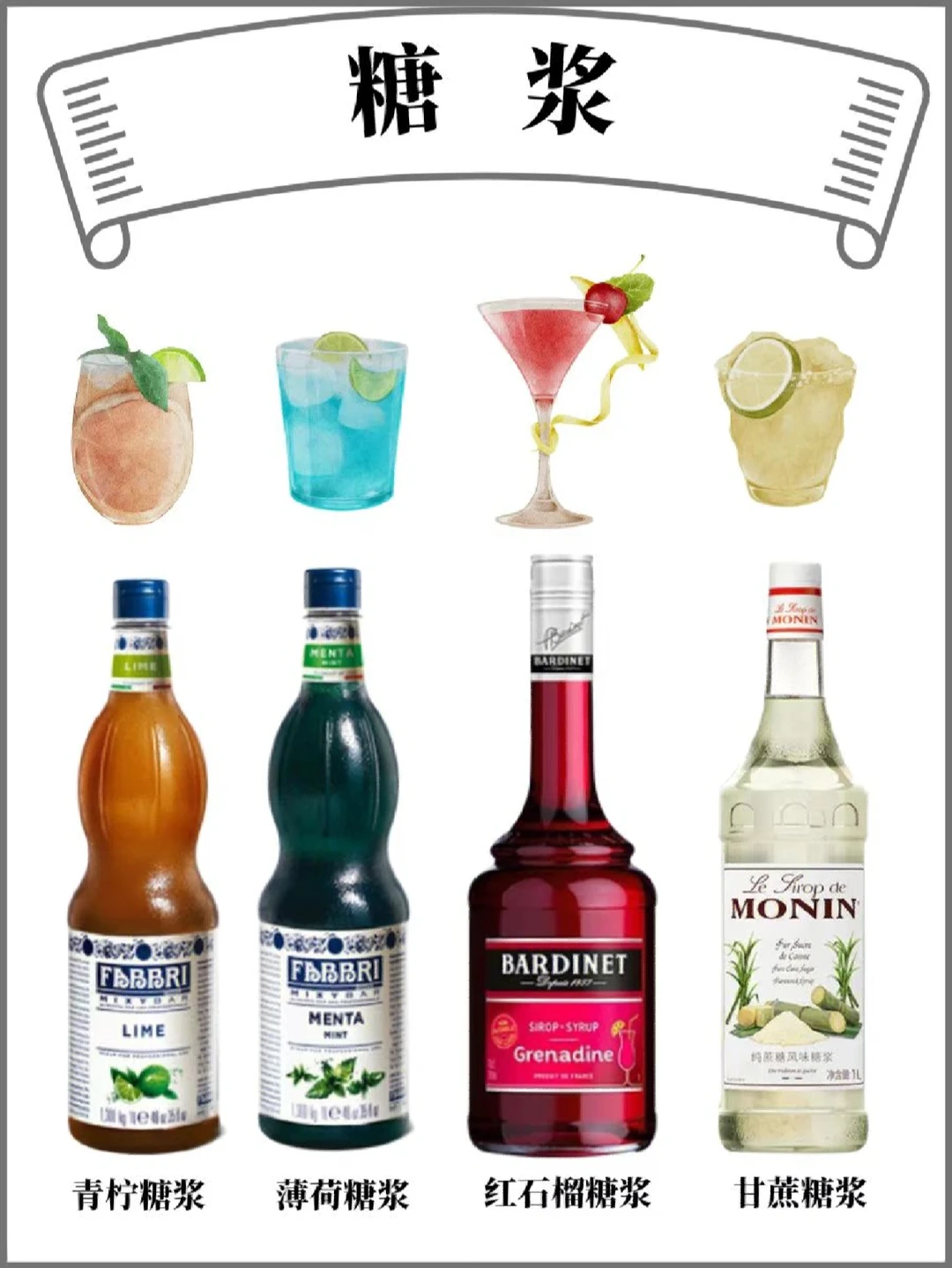 甘蔗糖浆、红石榴糖浆、薄荷糖浆、青柠糖浆