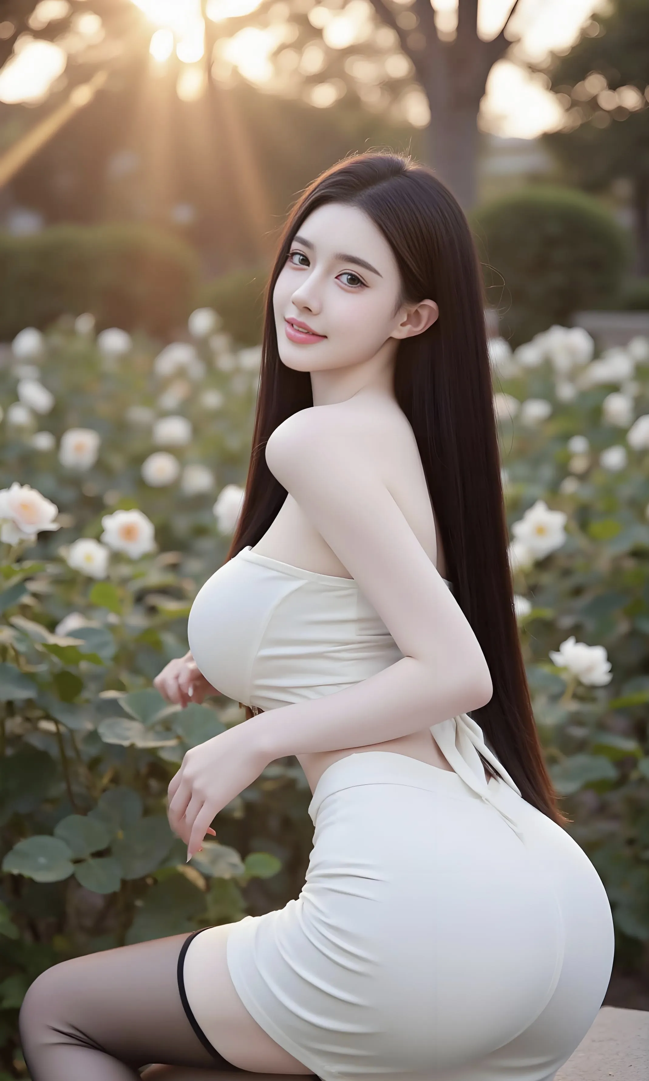 暮光漫过玫瑰丛,米白抹胸裹住玲珑身段,包臀裙随坐姿勾勒出流畅曲线,黑丝...
