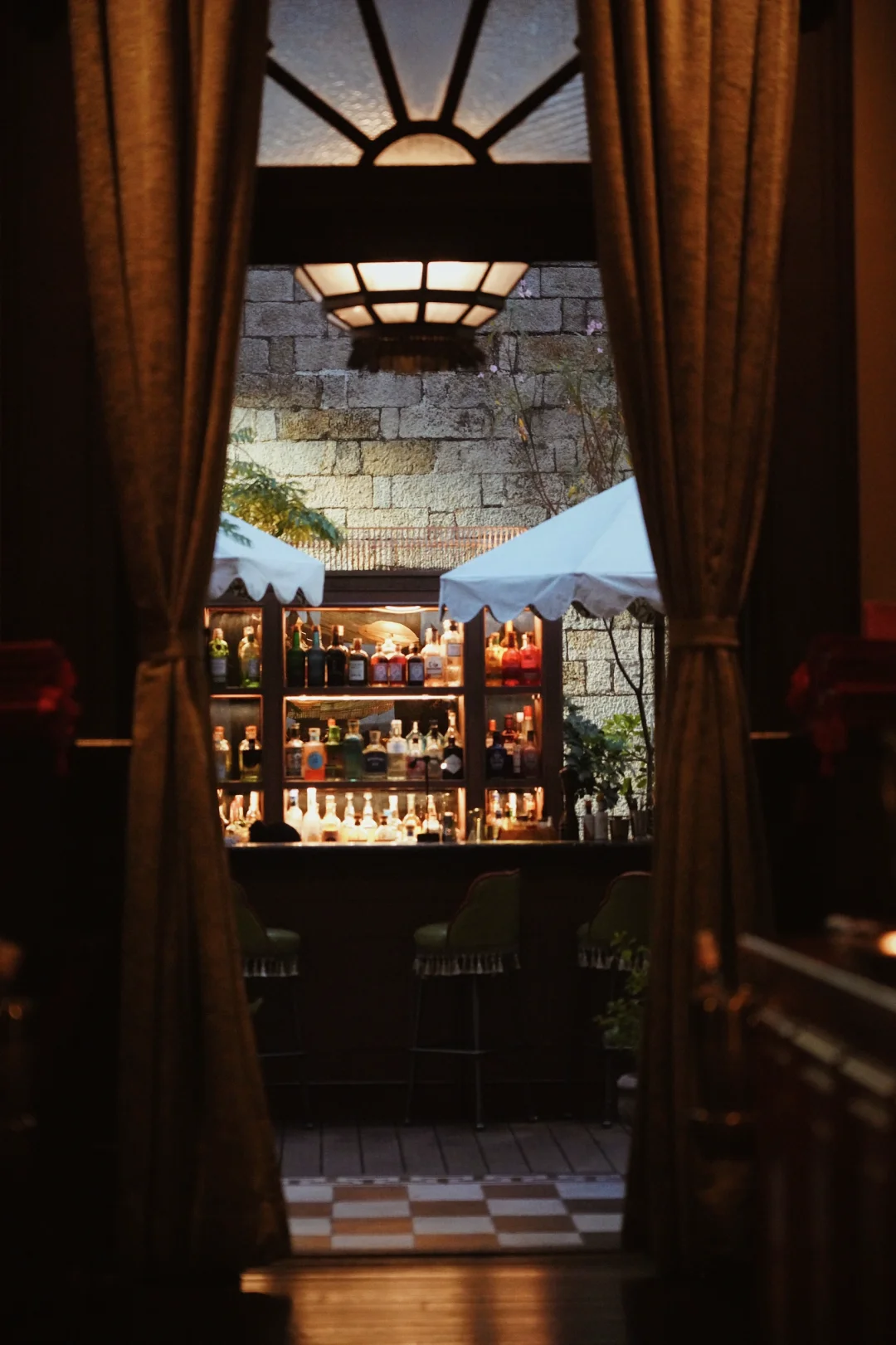 这家由香港最高法院改造的餐厅,红丝绒拱门+古董皮沙发,一秒穿越英伦贵族时代,仿佛来到《唐顿庄园》的场景。秘密花园户外Botanic Garden酒吧被绿植环绕,喝一杯Gin Tonic,有种置身伦敦秘境的感觉。