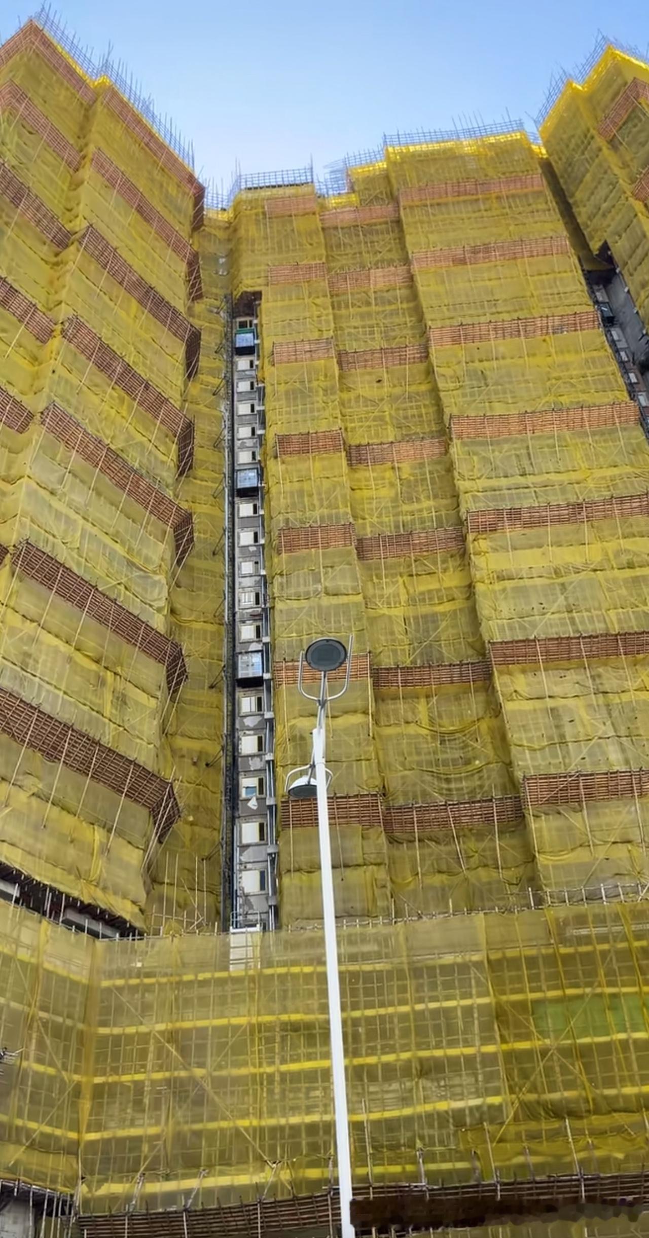 “香港的房子无论盖的多高,都是用竹架子搭的” ! 看看面前的竹架子,你就明白了火势为什么蔓延的那么快了。这几栋房屋是1983年左右的时候建造的,着火的时候正在进行旧楼的翻新,整栋楼周围搭的都是这种竹架子。要知道,竹子燃烧起来也是不得了的,有些地方还把竹子当做柴火来烧呢。 实在是想不明白,这么高的楼,为什么一定要用竹制脚手架呢,是因为竹子便宜吗?