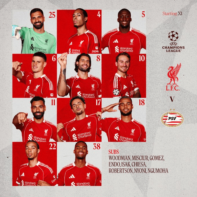 虎扑11月26日讯欧冠联赛第5轮,利物浦主场对阵埃因霍温。赛前,双方公布首发阵容: