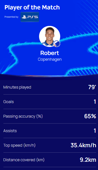 赛后,他也被欧足联技术小组评选为本场比赛的全场最佳球员。