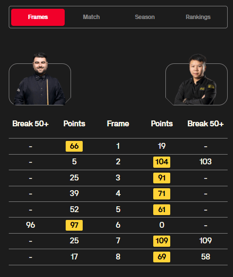 全场比赛,周跃龙出两杆破百(103、109)和一杆50+(58),克拉克打出一杆50+(96)。