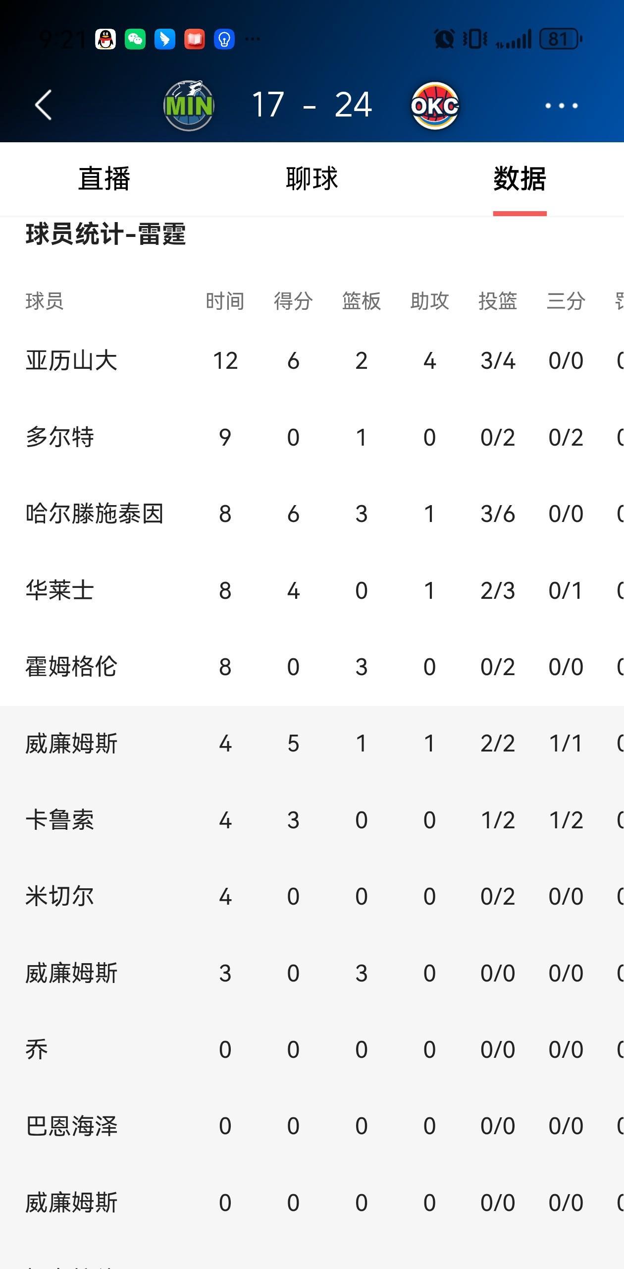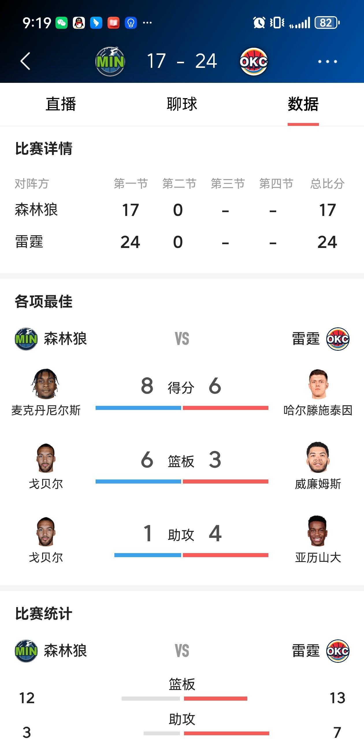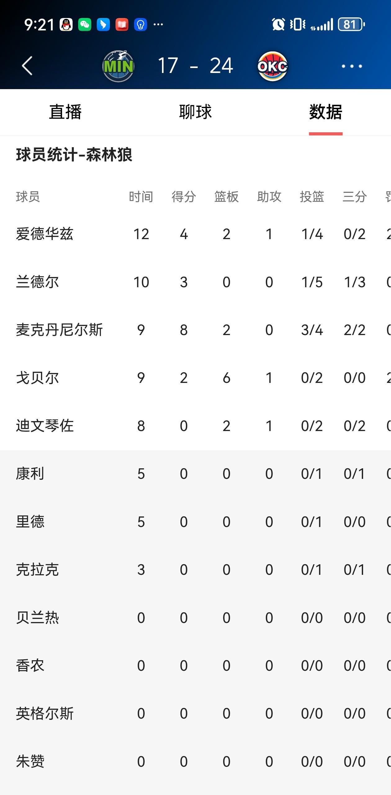直播NBA亚历山大VS爱德华兹,差距有点大 雷霆首节24:17领先森林狼,亚历山大4投3中,轻取6分2板4助,正负值为+7,爱德华兹4投1中,获4分2板1助,正负值为-7。而两队首节比分差距恰恰也是7分。 两队头号球星之间的差距有点悬殊,如果每节差7分,三节打完差21分,亚历山大又要提前一节打卡了。只是看首节比分,亚历山大30+还需要努力。 如果比分打花,亚历山大大胜三节打卡的负荷管理习惯,会为了30+的记录而改变吗?