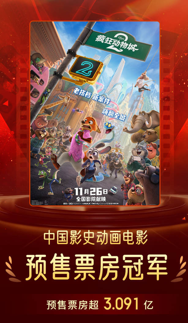 直播吧11月27日讯 据猫眼电影数据,《疯狂动物城2》预售票房(含零点场)超过3.091亿,刷新中国影史动画电影预售票房纪录,也是中国影史首部预售票房破3亿的进口动画电影。