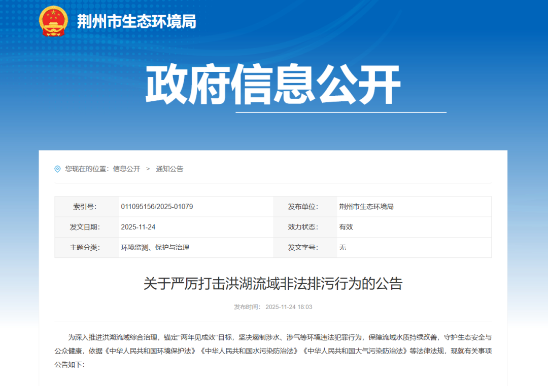 为深入推进洪湖流域综合治理,锚定“两年见成效”目标,坚决遏制涉水、涉气等环境违法犯罪行为,保障流域水质持续改善,守护生态安全与公众健康,依据《中华人民共和国环境保护法》《中华人民共和国水污染防治法》《中华人民共和国大气污染防治法》等法律法规,现就有关事项公告如下: