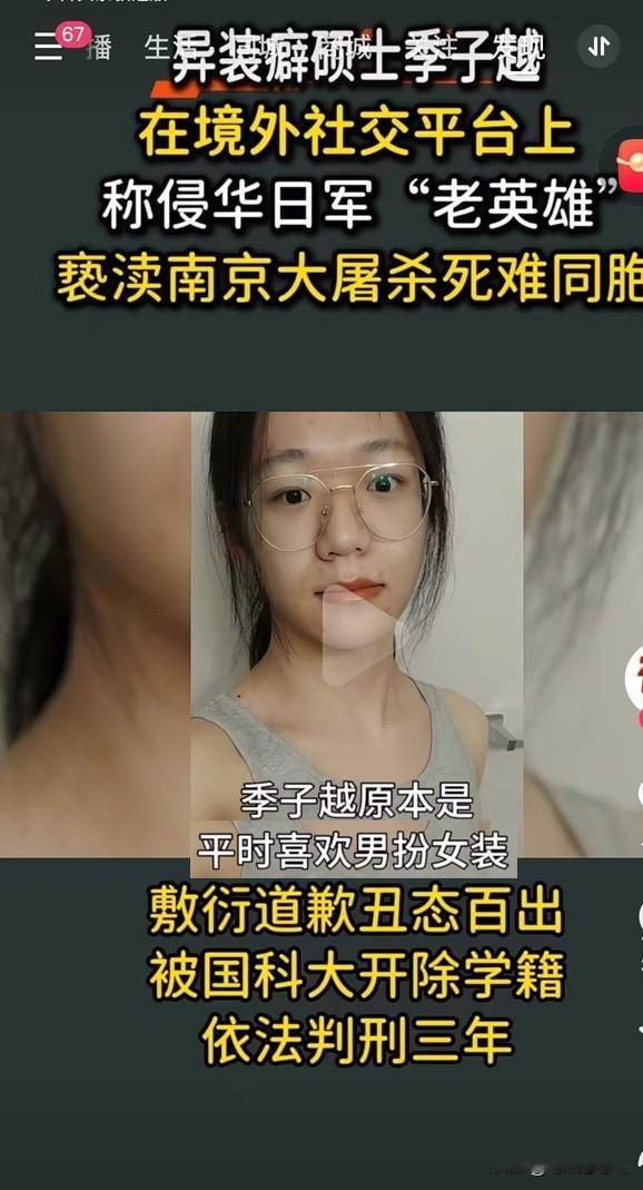 大家还记得“伪娘”季子越吗? 这位有着异装癖的“伪娘”叫季子越,网上爆出上个月出狱了。 大家不要以为㸰(不知道用什么称谓合适,“㸰”原指牛无角的怪异生物)是因为异装癖入刑的,咱们国家比较宽松,这种行为是心理疾病,不犯法。 㸰是因为2020年3月到6月,他用”神楽坂梓月”这个日本名字在美国疯狂发布反华言论。他把侵华日军叫”英雄的皇军战士”,说什么”南京是日本的南京”,还用”ZhiNa”这种侮辱性词汇来称呼中国,甚至称“南京大屠杀”是日本内政。 这个货居然还是中国科学院的一名大学生,2020年7月回国后,被国科大开除学籍,据说在2022年的时候被判刑三年。是否真被判刑,目前并没有找到相关的司法信息,不过从㸰的行为来看,确实面临相应的法律后果。 ————————