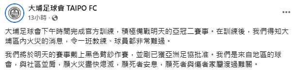 虎扑11月27日讯香港大埔宏福苑昨日(26日)发生重大火灾,截至今天凌晨已造成至少44人死亡及62人受伤。港超俱乐部大埔目前身在澳洲,将于今日出战亚冠2赛事,客场对阵澳超球队麦克阿瑟。